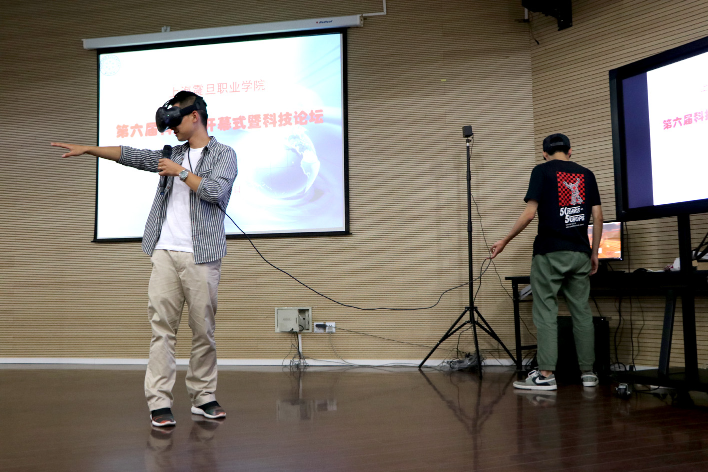 接下來,在輔導2017國賽虛擬現實賽項和文秘速錄賽項分別取得團體二等獎和三等獎的指導老師陳萍介紹了國賽經驗,并帶領虛擬現實賽項國賽選手為大家現場演示國賽學生作品,并邀請現場觀眾體驗了虛擬現實技術的震撼效果。