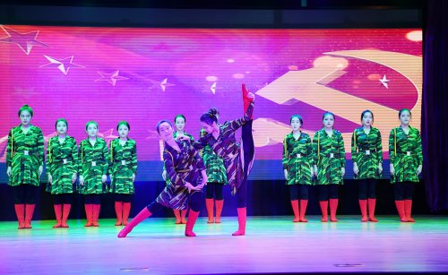 音樂舞蹈中心帶來的舞蹈《紅色贊歌》拉開了晚會的序幕。表演者們身穿迷彩服,迎著變換的燈光,那抹好似圣潔之光的綠色照進每一位震旦人的心,旋轉、跳躍,昂首挺胸的身姿踏著音樂的旋律,曼妙的肢體譜寫生命的律動之美,和諧之韻,舞出了對中國共產(chǎn)黨的深深敬意。