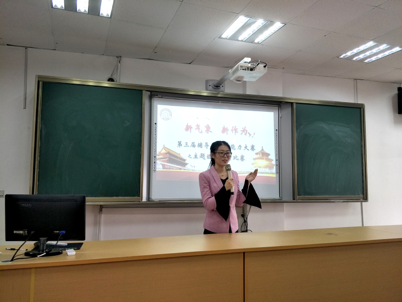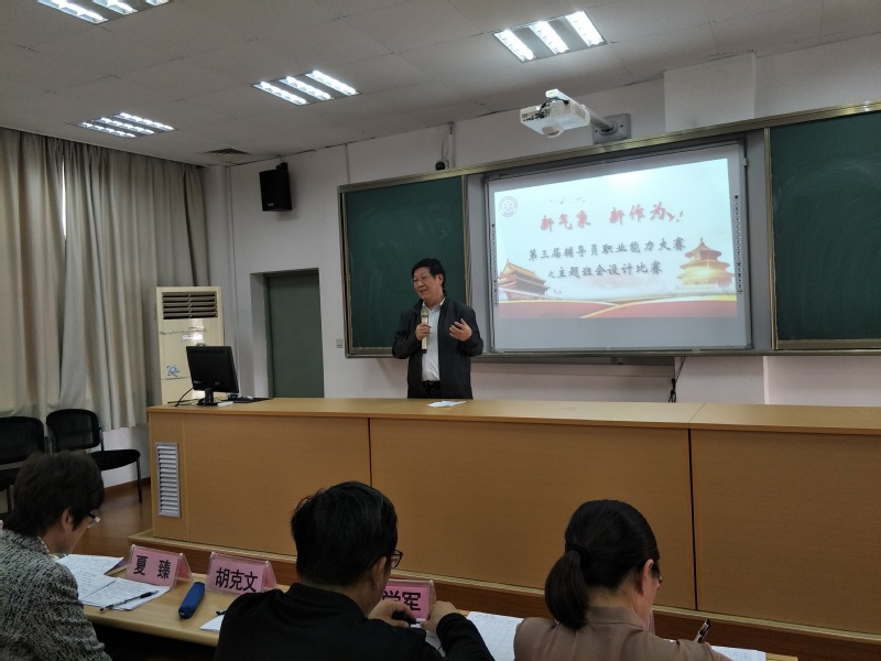 為了貫徹落實(shí)《普通高等學(xué)校輔導(dǎo)員隊(duì)伍建設(shè)規(guī)定》(教育部第43號(hào)令)和《高等學(xué)校輔導(dǎo)員職業(yè)能力標(biāo)準(zhǔn)(暫行)》(教思政〔2014〕2號(hào))文件精神,進(jìn)一步提升輔導(dǎo)員的思想素質(zhì)、職業(yè)技能和工作水平,2017年10月27日中午12:30,以“新氣象、新作為”為主題的第二屆輔導(dǎo)員主題班會(huì)設(shè)計(jì)比賽在教學(xué)樓1-209舉行。本次比賽有幸請(qǐng)到黨委副書記夏臻、宣傳部部長胡克文、院辦主任張莉、督導(dǎo)室主任胡建國、思政部主任魯學(xué)軍、學(xué)生處處長毛燕靜擔(dān)任評(píng)委,還請(qǐng)到50余學(xué)生代表作為學(xué)生評(píng)委。學(xué)生處所有老師、全體輔導(dǎo)員到場觀摩比賽,學(xué)生處資助中心主任廖文文主持比賽。