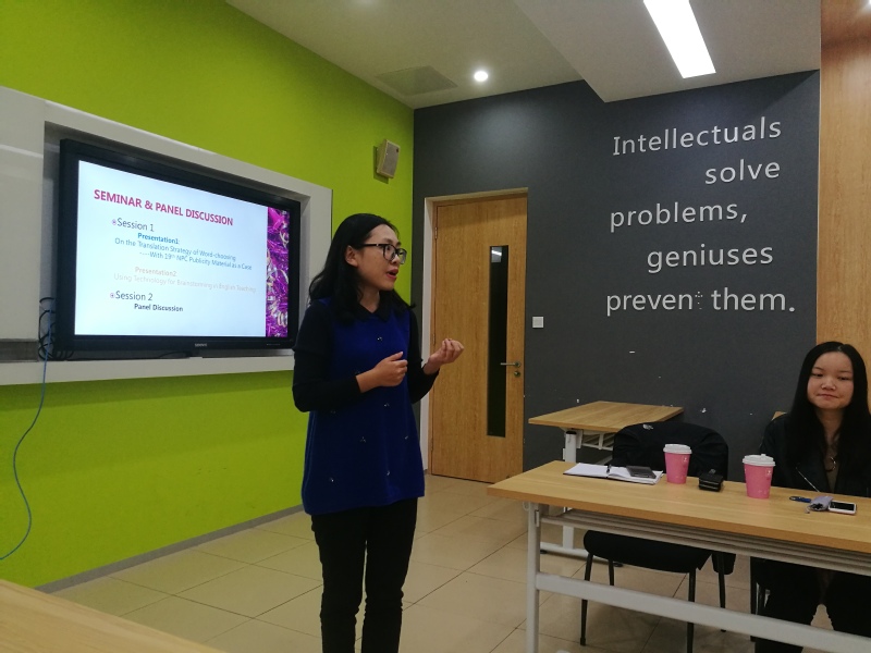 本次教學(xué)研共同體活動按國際化的學(xué)術(shù)研討會模式,營造了全英文的研討氛圍。首先,以學(xué)術(shù)研究的角度解讀“十九大”報告,創(chuàng)新了思政學(xué)習(xí)模式。基于平行語料庫理論架構(gòu),袁琨老師作了報告:On the Translation Strategy of Word-choosing----With 19th NPC Publicity Material as a Case(“十九大”外宣材料的選詞策略)。各位老師都獲益匪淺,既進行了英語專業(yè)學(xué)術(shù)研討,也學(xué)習(xí)了“十九大”報告。