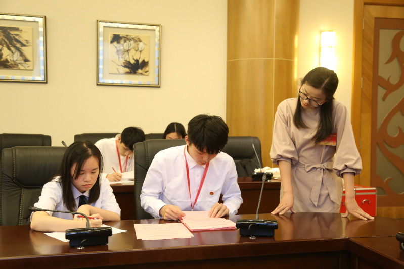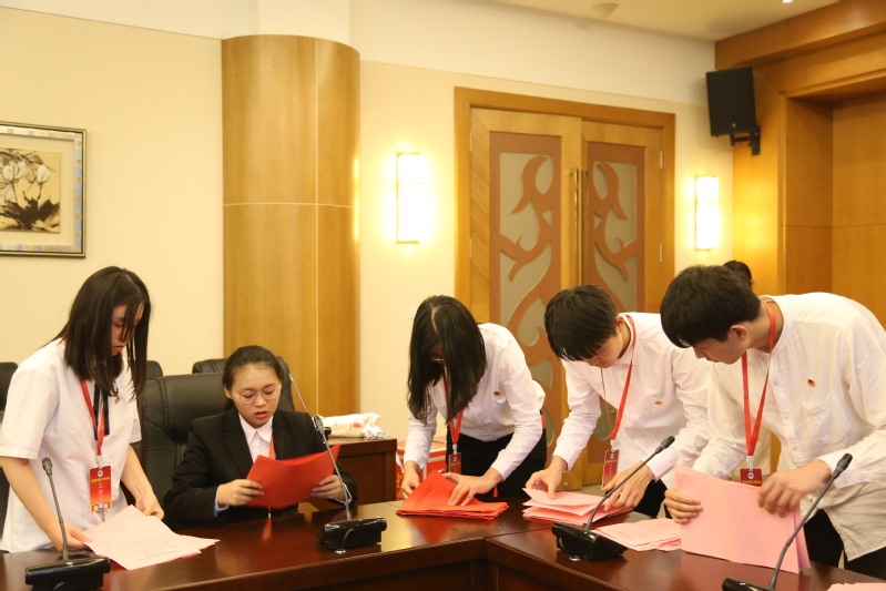 大會第五項議程,由提案工作組組長周懿婷同學做提案處理工作報告,大會共收到提案64件,內(nèi)容涉及學生成長成才、教育教學、校園文化、生活服務權(quán)益維護等方面,會后將有效提案提交至學校相關(guān)部門,并及時跟進后續(xù)提案處理工作。大會第六項議程,通過第八屆學生會主席團候選人名單(草案),并由校學生會副主席欒海貝介紹學生會主席團候選人情況。大會一致通過,王藝淇、周懿婷、傅文靜、阮智勇、胡冰、鄔吟吟六名同學作為本次學生會主席團選舉的正式候選人。大會第七項議程,通過第二屆學生常任代表委員會委員候選人名單(草案),并由第一屆常任委員會主任韓文軒介紹常任代表委員會候選人情況。大會一致通過,王愷、李萱、楊諾穎、肖忠明、金鑫、徐一帆、曹哲駿等11名同學成為本次學生會學生常任代表委員會委員正式候選人。大會第八項議程,通過大會選舉辦法(草案),并由校學生會副主席謝碧穎宣讀并通過大會選舉辦法(草案),大會一致舉手表決通過。大會第九項議程,通過大會監(jiān)票人員名單(草案),并由校學生會副主席李昊岳宣讀監(jiān)票人員名單(草案),大會一致通過黃鈺軒等6名同學擔任監(jiān)票人。在同學們有序進行投票后,進行大會第十一項議程,審議并通過《關(guān)于學生會工作報告的決議》,并由校學生會文藝部部長傅文靜宣讀。經(jīng)過監(jiān)票人員緊張的統(tǒng)計后,選舉工作組總監(jiān)票人黃鈺軒同學向大會報告選舉結(jié)果。