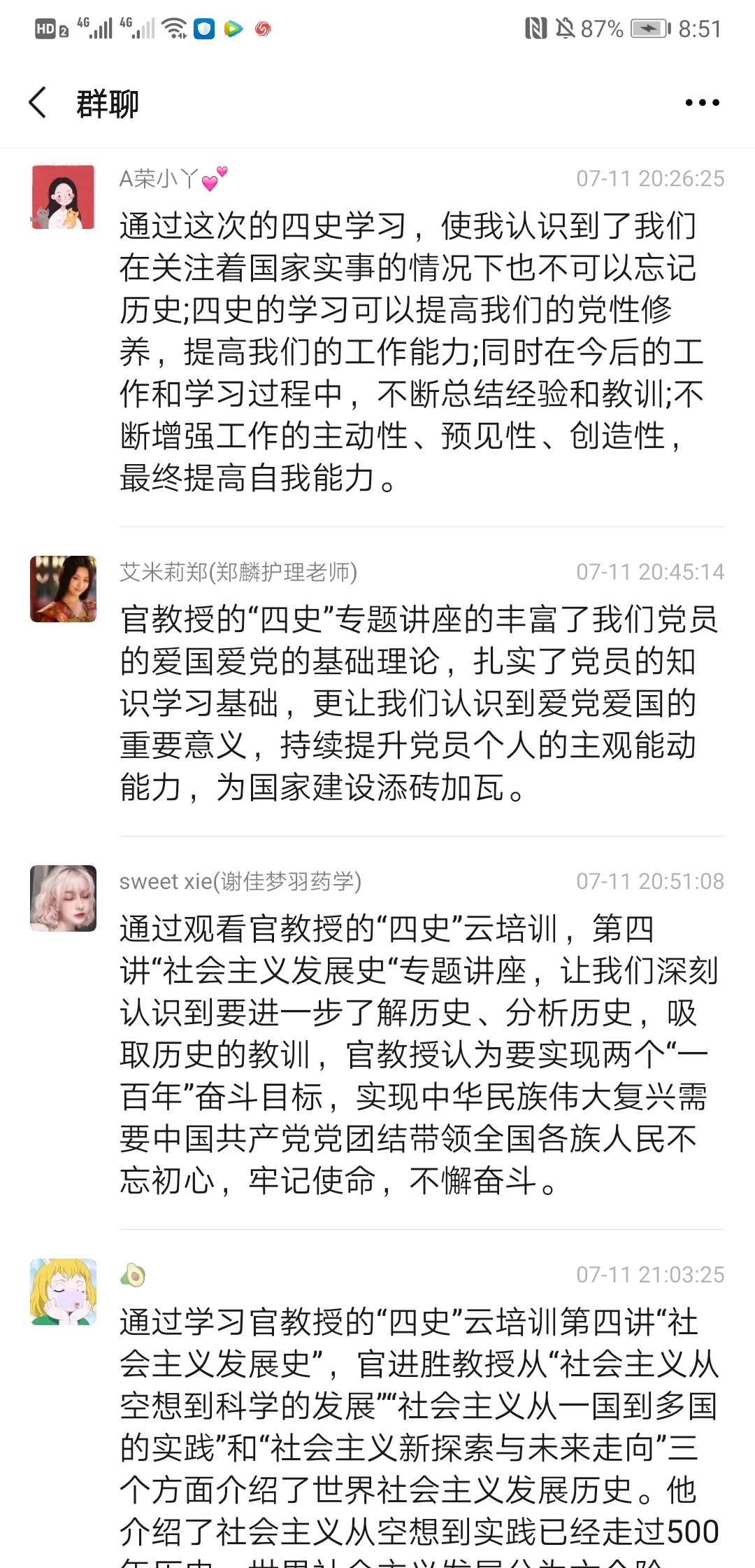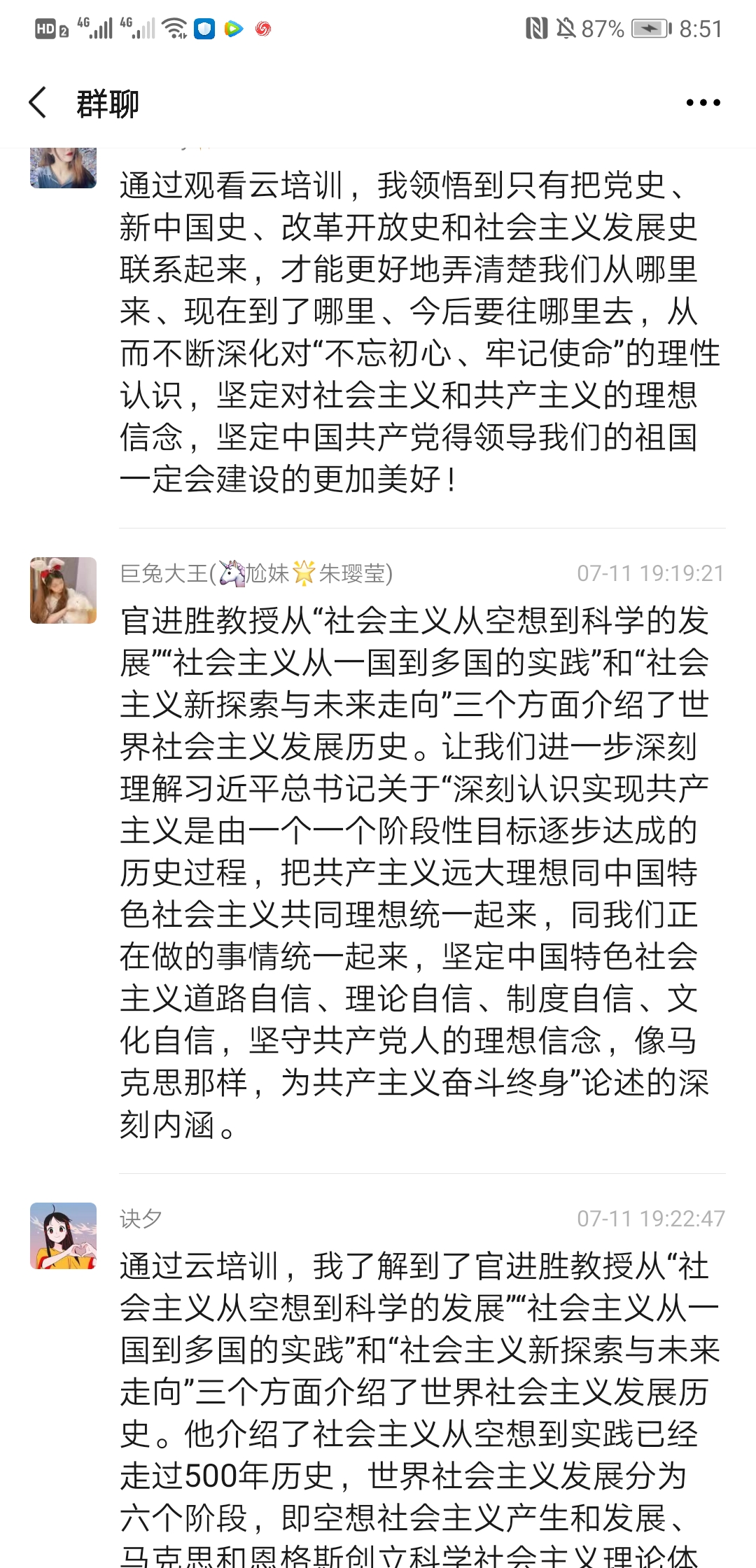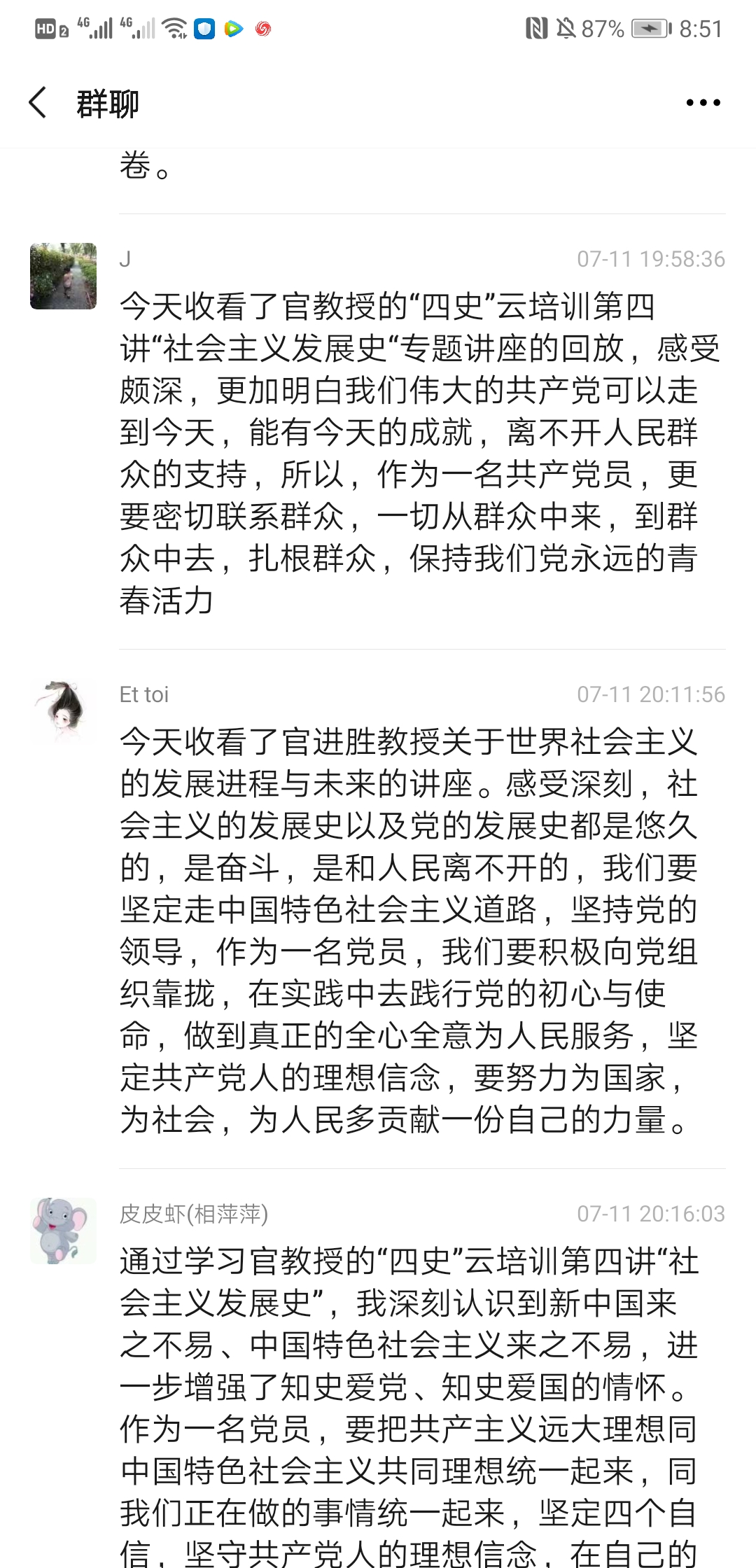 2020年7月10日上午9:30,上海民辦高校干部和黨員研修基地“四史”云培訓(xùn)第四講“世界社會主義的發(fā)展進(jìn)程與未來”專題講座準(zhǔn)時開講,主講人是上海市委黨??茖W(xué)社會主義教研部主任官進(jìn)勝教授。為加強師生黨員同志對社會主義發(fā)展史的認(rèn)識和理解,公共衛(wèi)生與護(hù)理學(xué)院黨總支組織所有師生黨員收看了官教授的講座,并于11日晚19:00-20:00開展了一次線上研討會,共同探討本次講座的學(xué)習(xí)心得與體會,師生黨員同志們系統(tǒng)地回顧了世界社會主義的發(fā)展歷程,進(jìn)一步加深了對社會發(fā)展規(guī)律的認(rèn)識,增強了對中國走社會主義道路的決心和信心,對世界社會主義的美好前景充滿期待。以下是部分同志發(fā)言記錄: