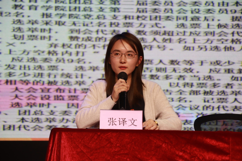 張譯文老師宣讀《教育學(xué)院團(tuán)總支第二屆委員會委員選舉辦法》,并經(jīng)舉手表決,一致通過。