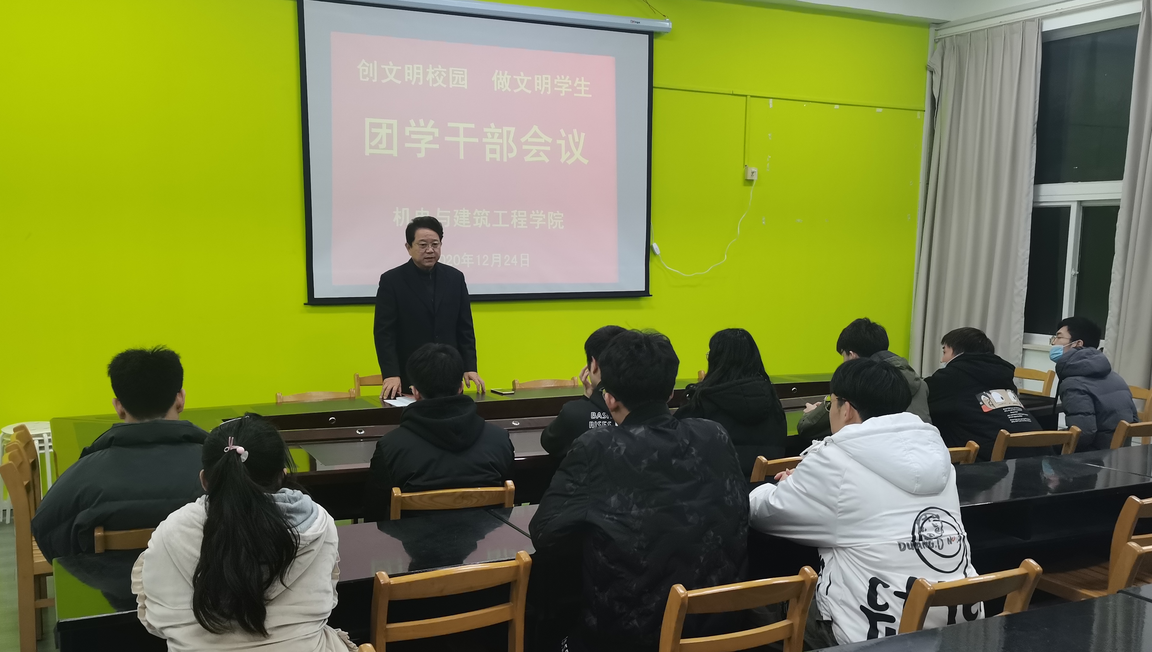 12月24日晚,機(jī)電與建筑工程學(xué)院召開(kāi)團(tuán)學(xué)干部會(huì)議,在前期工作的基礎(chǔ)上,講評(píng)總結(jié)、強(qiáng)化抓手、補(bǔ)齊短板、落細(xì)落實(shí)。學(xué)院黨總支書(shū)記陳亞立主持會(huì)議,學(xué)院團(tuán)學(xué)干部、20級(jí)各班班長(zhǎng)、團(tuán)支書(shū)與會(huì)。