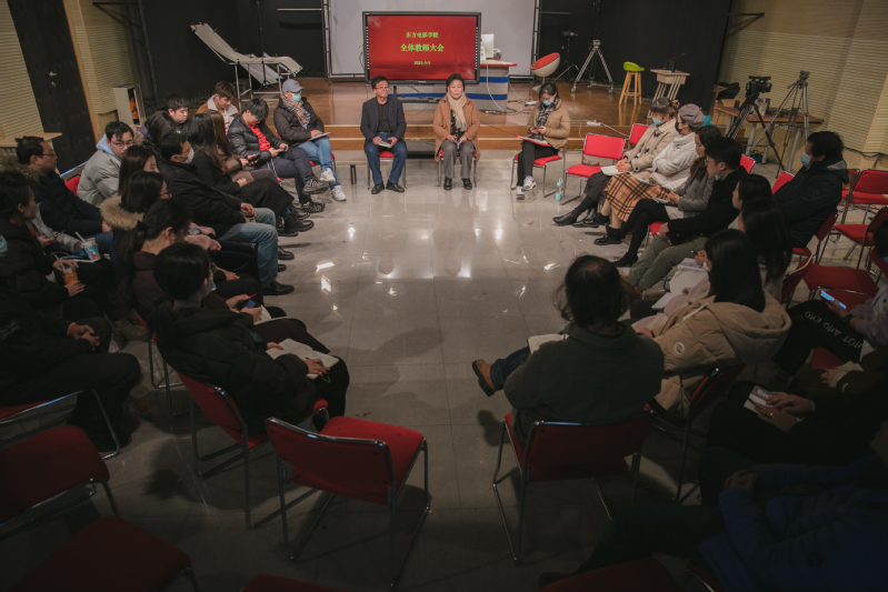 東方電影學院副院長祝華東老師講話。他從“兩院合并的意義”、“內(nèi)部資源的優(yōu)化與共享”、“教學過程優(yōu)化與效果提升”、“專業(yè)技能培養(yǎng)與崗位對標”等四個方面談了自己對新學院成立后教學工作、專業(yè)建設、課程建設、產(chǎn)學結(jié)合、校企合作的深度思考。并圍繞學院今后的工作提出了四點要求:一是面對學校轉(zhuǎn)設、十四五規(guī)劃開局的新形勢、新任務、新要求,全體教師要創(chuàng)新思維,緊緊跟上學校發(fā)展的步伐,在教學實踐、產(chǎn)教融合、校企合作等方面不斷探索新思路新方法;二是加快教師間的融合、工作間的磨合、專業(yè)課程間的結(jié)合,“老東影”、“老傳媒”都已成為歷史,曾經(jīng)的成績都已翻篇,要面向未來開啟新的篇章;三是優(yōu)化專業(yè)和課程設置、優(yōu)化人員配置,要求各專業(yè)主任注重加強本專業(yè)教學、科研工作,立足專業(yè)規(guī)律、市場需求做好人才培養(yǎng)方案的調(diào)整,充分調(diào)動專業(yè)教師的工作積極性和能動性,不斷打造專業(yè)亮點,形成專業(yè)特色,擦亮東方電影學院這塊品牌;四是加強教學過程的組織和優(yōu)化,把握學生的關(guān)注點,了解學生的缺失點,知曉學生的需求點,填缺口補短板,不斷優(yōu)化人才培養(yǎng)過程`,實現(xiàn)教學質(zhì)量的穩(wěn)步提高。針對招生工作,祝華東副院長強調(diào),招生工作是學院的生命線,是學院生存和發(fā)展的基礎,希望全院師生行動起來共同參與招生,廣泛匯集社會資源,凝心聚力,眾志成城,取得今年招生工作的新勝利。