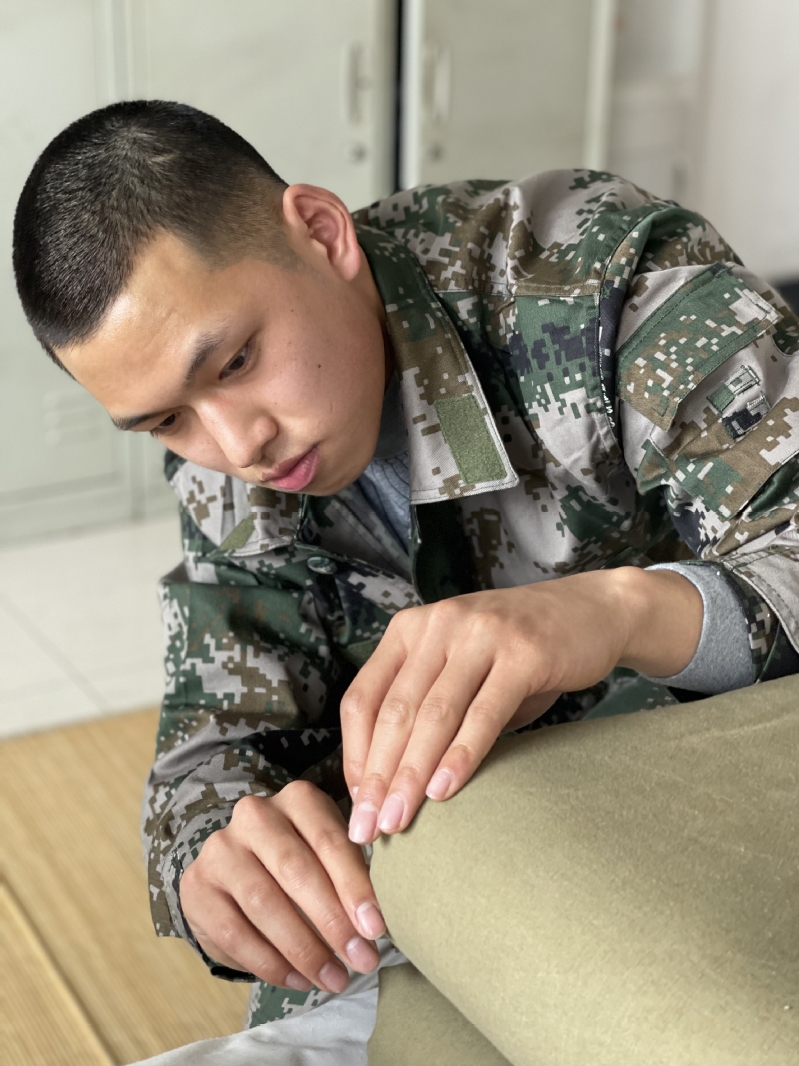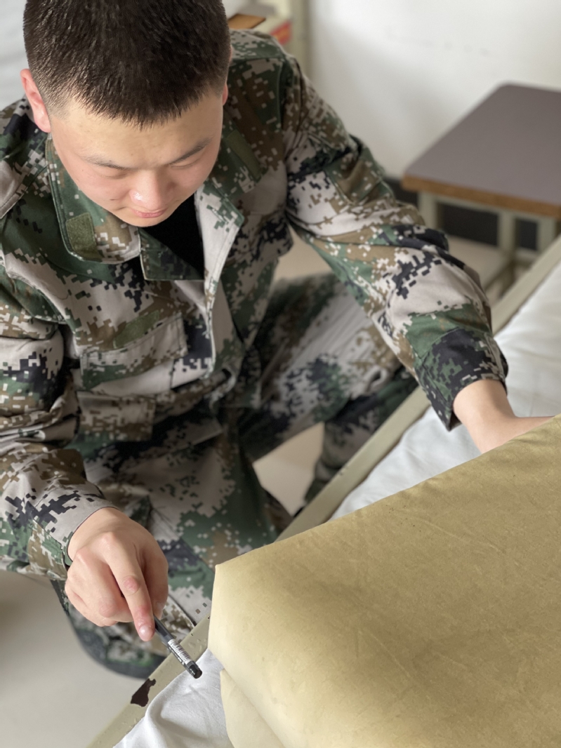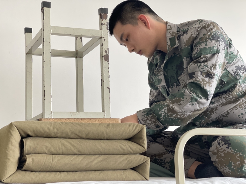 初入軍營,先從學(xué)習(xí)整理內(nèi)務(wù)開始,學(xué)習(xí)如何鋪床、疊軍被、規(guī)范個人物品的擺放。在軍營就要以軍人的優(yōu)秀品質(zhì)和標(biāo)準(zhǔn)來要求自己。壓床被、理枕頭、磨棱角,沒幾天,整潔干凈的床上都擺上一個個標(biāo)準(zhǔn)的“豆腐塊”。