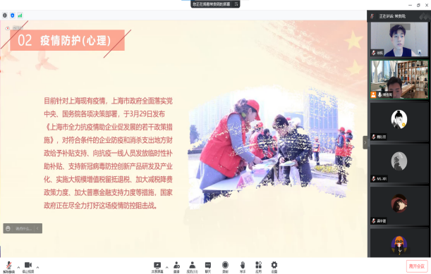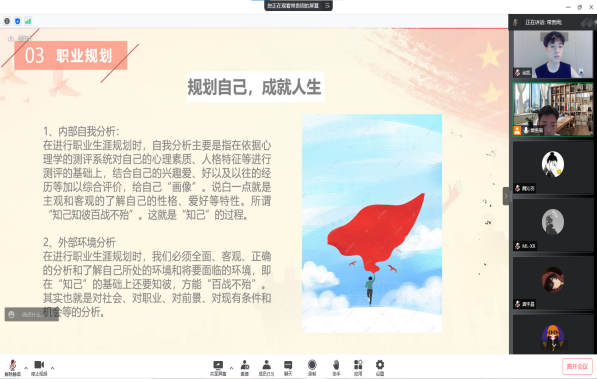 團(tuán)支書常貴周和心理委員李昊川先后發(fā)言,對(duì)心理健康與亞健康給人造成的影響進(jìn)行闡述,并希望同學(xué)們都能夠有一個(gè)持續(xù)且積極發(fā)展的心理狀態(tài),充分發(fā)揮身心潛能,尤其在疫情期間,心理活動(dòng)的頻率、幅度可能會(huì)增加,倡導(dǎo)大家通過(guò)健康飲食、保障睡眠等方式對(duì)自身心理壓力進(jìn)行緩解。另外,大學(xué)時(shí)光已經(jīng)過(guò)半,職業(yè)規(guī)劃顯得越來(lái)越重要,它就是我們?nèi)松飞系臒羲?、航?biāo),照亮和指引前進(jìn)的方向,希望同學(xué)們沉下心對(duì)自己的職業(yè)生涯乃至人生進(jìn)行系統(tǒng)的計(jì)劃。