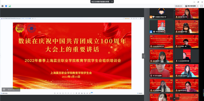 2022年5月10日,慶祝中國(guó)共產(chǎn)主義青年團(tuán)成立100周年大會(huì)在北京人民大會(huì)堂隆重舉行。為提高我院學(xué)生思想理論水平和政治素養(yǎng),鼓勵(lì)廣大青年匯聚青春力量,砥礪前行,讓夢(mèng)想騰飛,5月15日,教育學(xué)院學(xué)生會(huì)春季培訓(xùn)會(huì)于線上會(huì)議順利召開(kāi),學(xué)院團(tuán)總支委員參加線上會(huì)議。會(huì)議由團(tuán)總支書(shū)記吳蜜蜜老師主持。