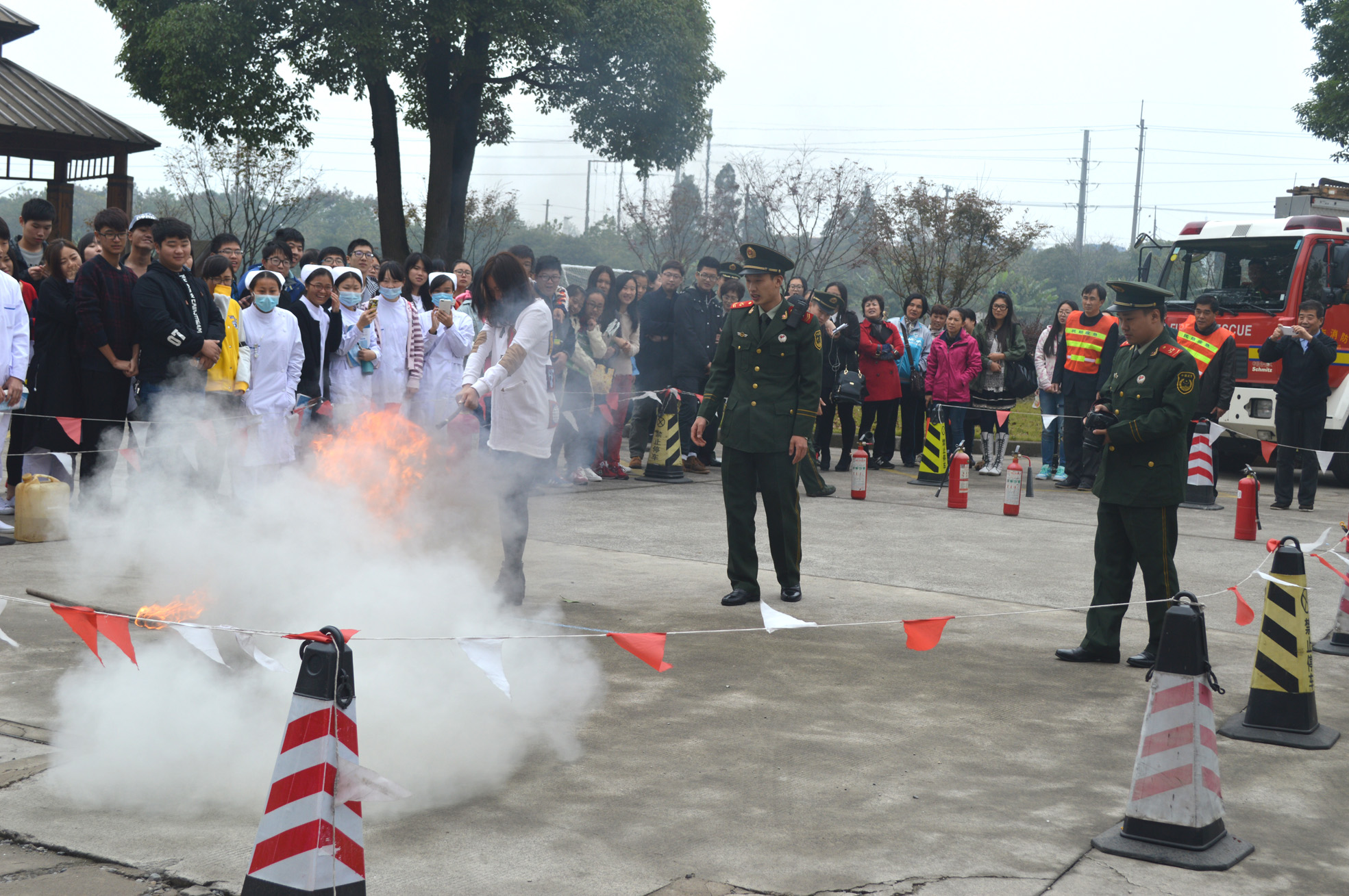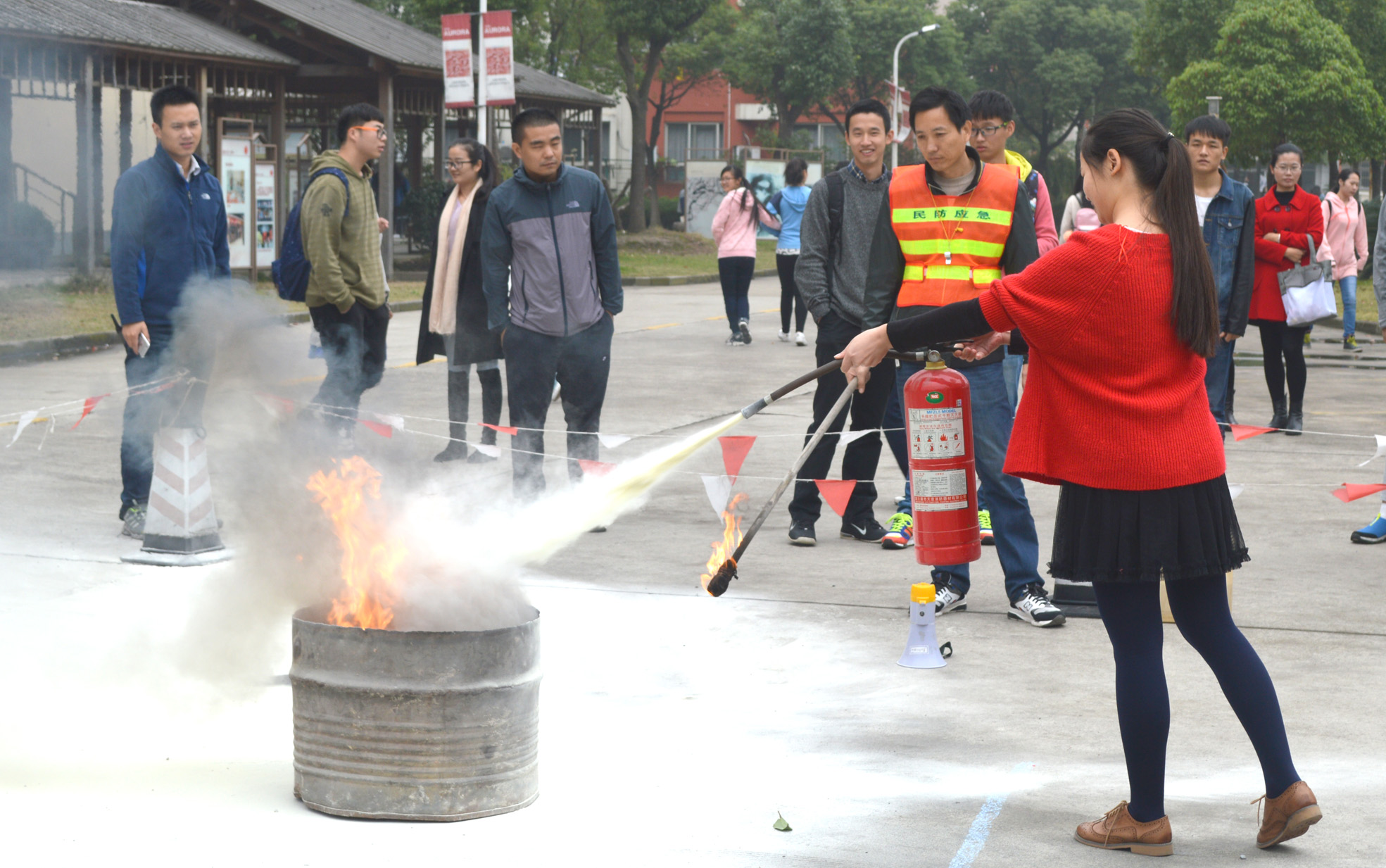 疏散演練結(jié)束后,又組織師生參加了消防滅火演練。來自寶山羅店消防中隊(duì)的趙教官為大家詳細(xì)介紹了二氧化碳和干粉滅火器的性質(zhì)并現(xiàn)場(chǎng)示范兩種滅火器的使用方法。參加消防滅火演練的師生和后勤的工作人員(宿管、保潔)分成15個(gè)組,每組師生按照操作示范,提著滅火器沖到離火焰約3米處,對(duì)準(zhǔn)著火點(diǎn)進(jìn)行高壓噴射,火很快就被撲滅。通過親身體驗(yàn),師生們基本掌握了滅火器的使用方法。