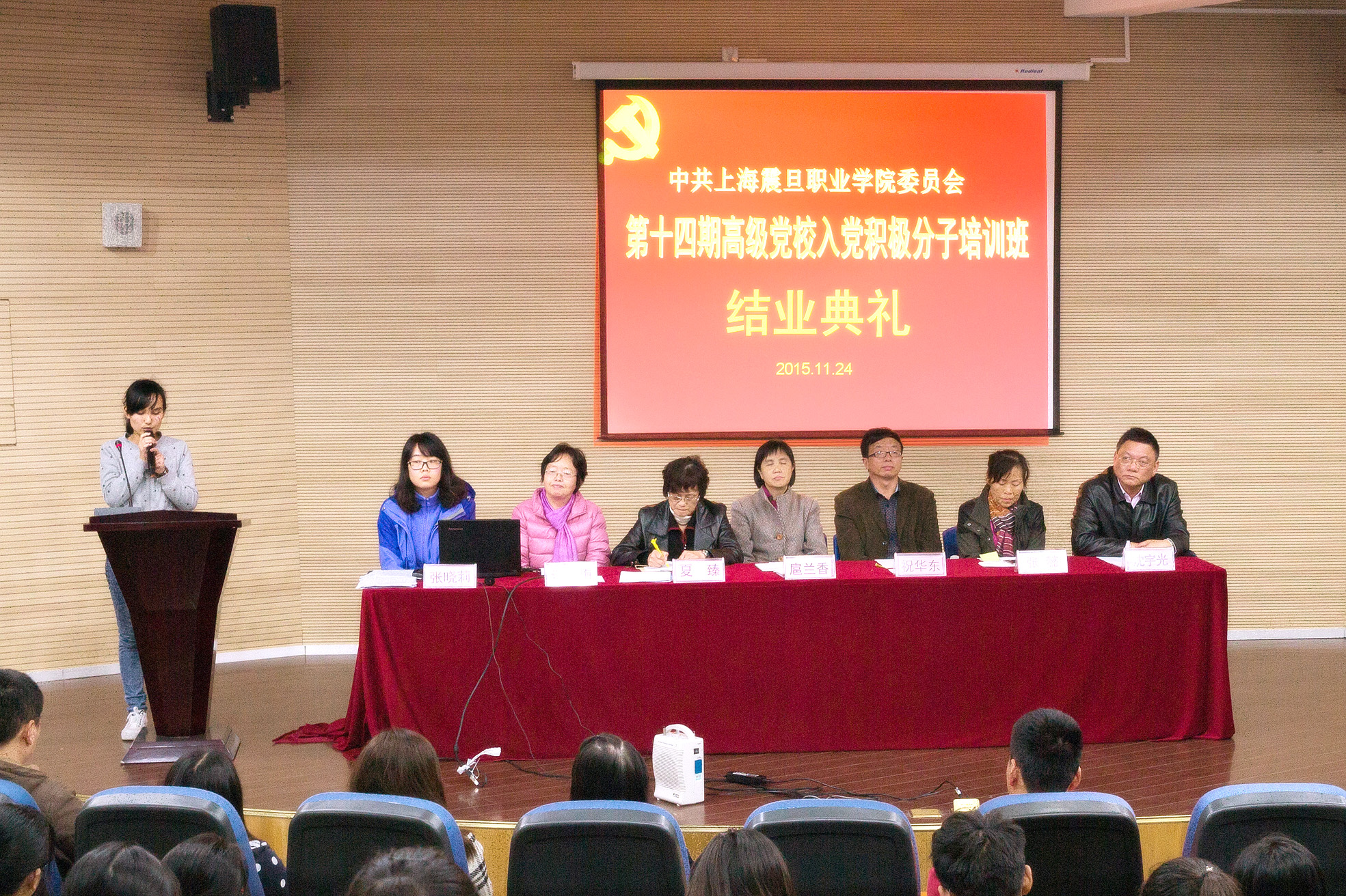 2015 年11月 24 日下午,上海震旦職業(yè)學(xué)院第十四期高級(jí)黨校入黨積極分子培訓(xùn)班結(jié)業(yè)典禮在體藝樓報(bào)告廳舉行,黨委副書記夏臻和各二級(jí)學(xué)員黨總支(直屬支部)書記參加了結(jié)業(yè)典禮。