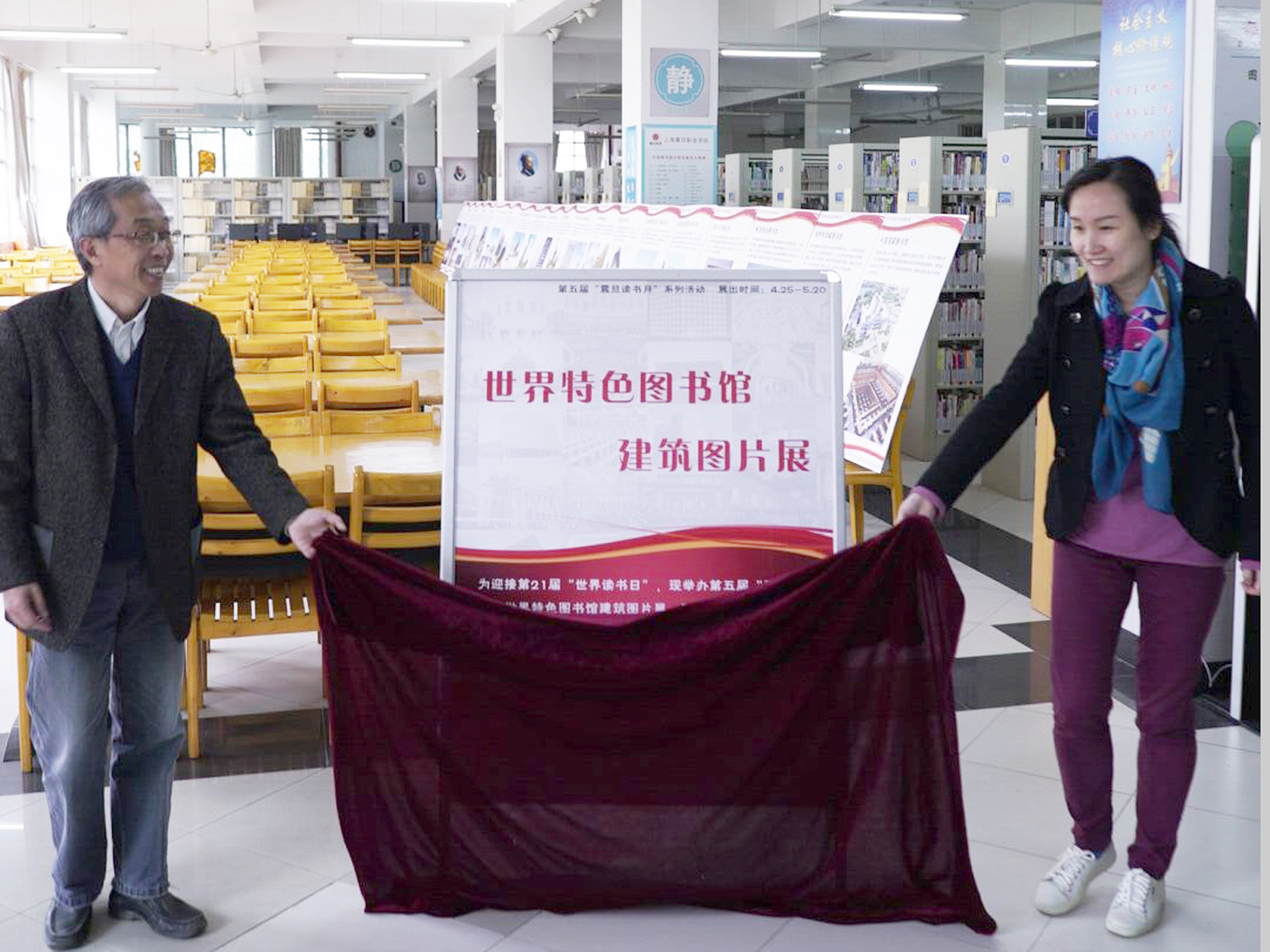 4月25日中午,第五屆“震旦讀書月”系列活動之“世界特色圖書館建筑圖片展”在圖書館閱覽室開幕,上海震旦教育集團張沈董事長、學院圖書館張健館長、信息中心金瑤副主任、圖書館代表及學生讀者參加了展覽揭幕儀式。