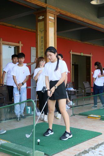 活動第一天,主要進行了高爾夫、攀巖、劃船、射箭和團體大腳板等五項活動。同學們分組之后首先進行的是劃船,換上救生衣兩兩一組,開始大家都沒有經(jīng)驗,很多組的小船在原地打轉(zhuǎn),很快就有同學掌握了技巧,如何把小船順利往前劃而不會搖晃,熟練的同學紛紛向大家分享經(jīng)驗。