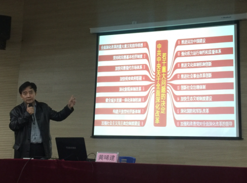 11月10日晚,學(xué)院黨委書記黃晞建教授為我院高級黨校學(xué)員做了《面向未來,你準(zhǔn)備好了嗎?》的主題報告。報告深入淺出的對十八大三、四、五、六中全會的邏輯關(guān)系進(jìn)行了講解,并結(jié)合中共中央關(guān)于全面深化改革若干問題的決定和"十三五"規(guī)劃綱要草案中的民生看點,從生育政策、教育改革、就業(yè)創(chuàng)業(yè)、城鄉(xiāng)統(tǒng)一的建設(shè)用地、醫(yī)療保障制度、國家產(chǎn)權(quán)保障體制改革等方面進(jìn)行了分析,學(xué)員們受益匪淺。