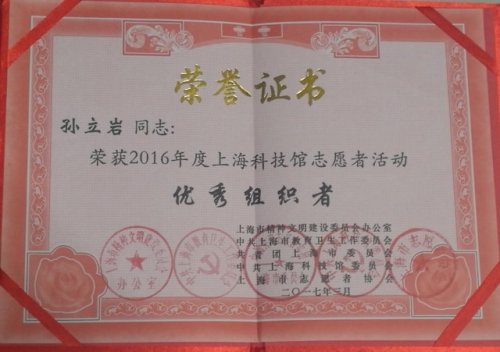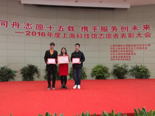 表彰會上,我校被授予“2016年度上??萍拣^志愿者活動表揚集體”。我校孫立巖老師被授予“2016年度上??萍拣^志愿者活動優(yōu)秀組織者”稱號,社會實踐部沈毅同學(xué)、劉雷同學(xué)被授予“2016年度上??萍拣^志愿者活動積極分子”稱號。