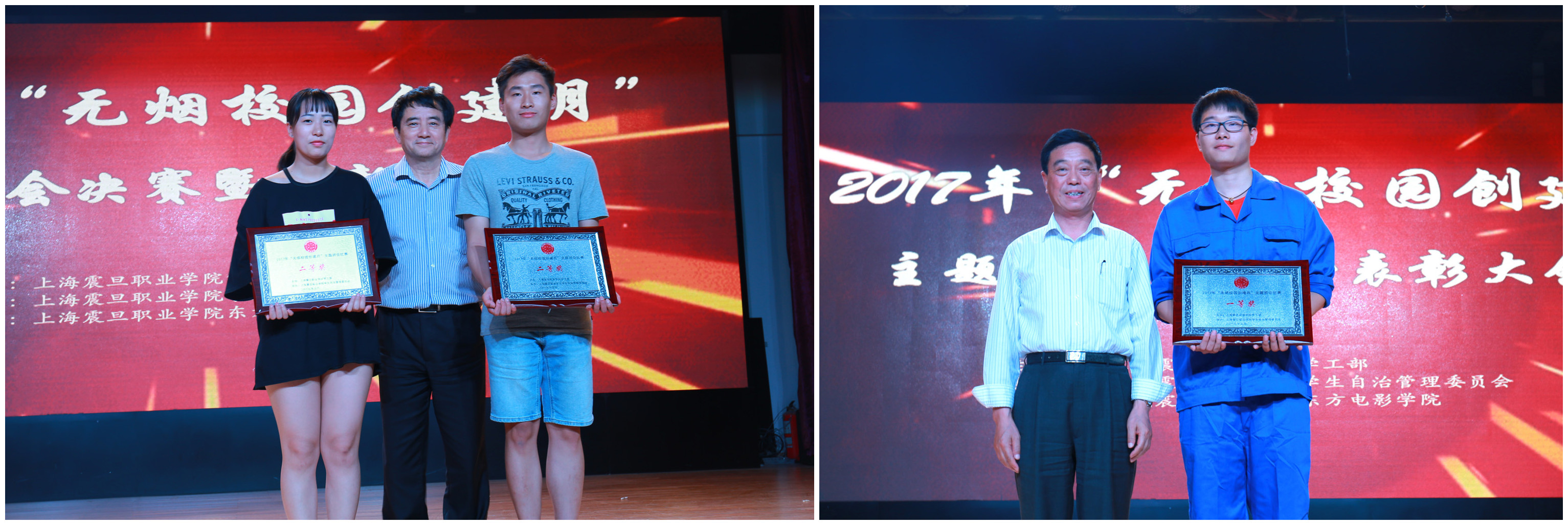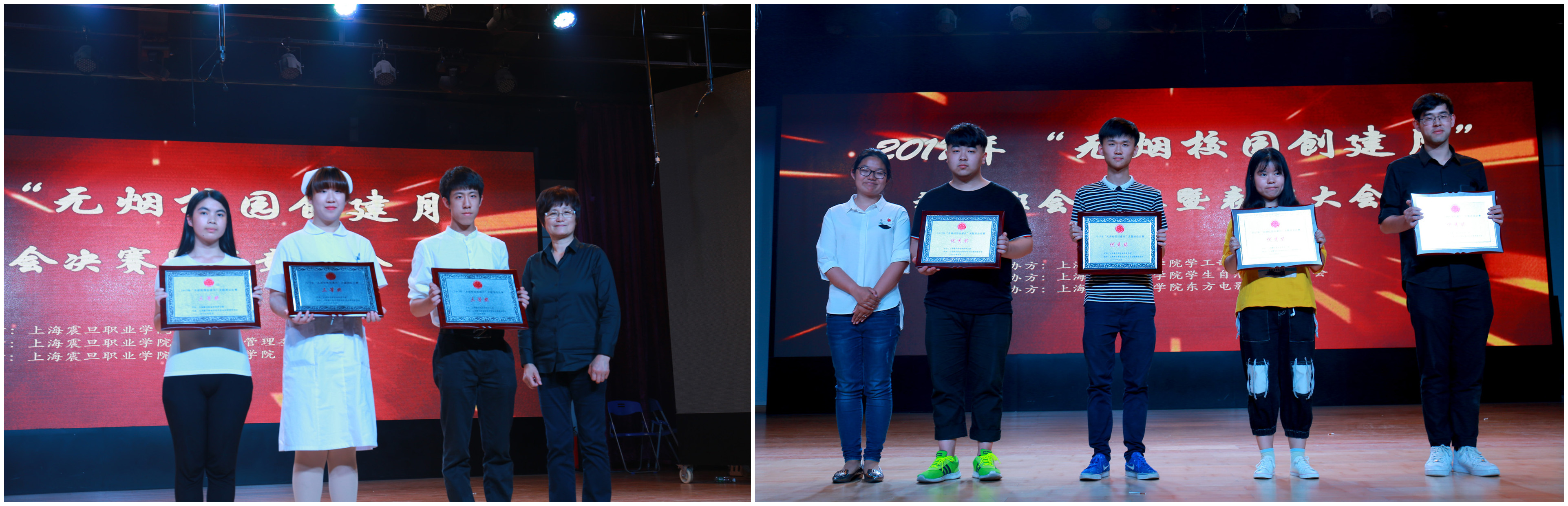 5月31日16:30在學(xué)院大禮堂開展了2017年“無煙校園創(chuàng)建月”禁煙主題班會(huì)決賽暨表彰大會(huì),出席本次大會(huì)的有上海震旦職業(yè)學(xué)院黨委書記黃晞健,校長(zhǎng)陳力華,黨委副書記夏臻,學(xué)工部部長(zhǎng)毛燕靜,文明辦主任黃敏,團(tuán)委書記曹曉莉,以及各二級(jí)學(xué)院黨總支書記和輔導(dǎo)員。大會(huì)分為兩大部分。首先開展禁煙主題班會(huì)決賽,各學(xué)院代表隊(duì)通過PPT演說加情景劇的形式來呈現(xiàn),最終16機(jī)電獲得一等獎(jiǎng),16護(hù)理7班、16音像班獲得二等獎(jiǎng),16會(huì)計(jì)2班、16護(hù)理5、6班、16學(xué)前3班獲得三等獎(jiǎng),15營(yíng)養(yǎng)監(jiān)測(cè)班、16藝術(shù)班、16數(shù)字傳媒班、16工商班分獲優(yōu)秀獎(jiǎng)。大會(huì)第二部分由校領(lǐng)導(dǎo)對(duì)本屆“無煙校園創(chuàng)建月”系列活動(dòng)獲獎(jiǎng)同學(xué)和班級(jí)進(jìn)行表彰和頒獎(jiǎng)。
