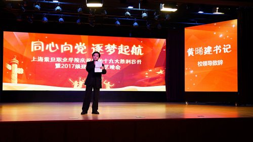 10月18日晚上18點,由校團委主辦,校學生會承辦的《同心向黨逐夢起航》上海震旦職業(yè)學院慶祝黨的十九大勝利召開暨2017級新生晚會在校大禮堂隆重舉行。校董事長張沈老師、黨委書記黃晞建教授、黨委副書記、校長陳力華教授、校黨委副書記夏臻教授,以及各職能部處室負責人、各二級學院黨政領導和輔導員老師們與學生們一起觀看了本次晚會演出,共同慶祝黨的十九大勝利召開。