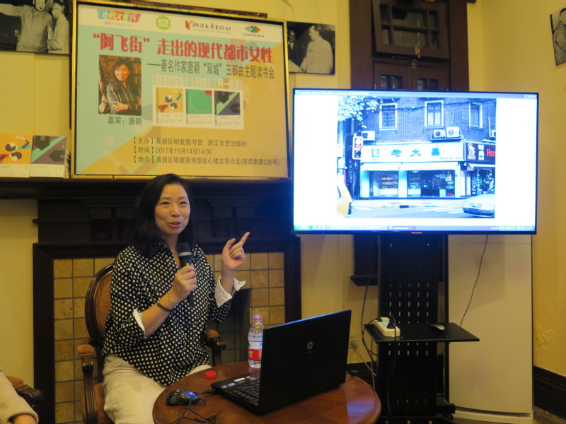唐穎老師是土生土長(zhǎng)的上海人。她的三本小說(shuō)《阿飛街女生》、《另一座城》、《初夜》就是以她年少成長(zhǎng)的上海街區(qū)作為重要場(chǎng)景來(lái)撰寫(xiě)的。講座中,唐穎老師圍繞著這三本小說(shuō)講述了她曾經(jīng)年代的故事并展示了珍貴的圖片,通過(guò)述說(shuō)還原了當(dāng)年的時(shí)代面貌。