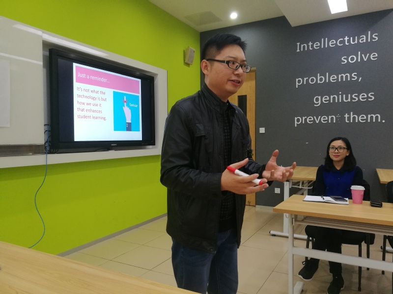 之后,以創(chuàng)新教學(xué)手段的角度,王斌老師作了報告:Using Technology for Brainstorming in English Teaching(使用科技手段促進英語教學(xué)互動), 匯報了英國培訓(xùn)期間的學(xué)習(xí)成果,并與全體教師進行了現(xiàn)場實踐,現(xiàn)場氣氛熱烈,大家都認為這既是與國際接軌的教學(xué)技術(shù)手段研究和實踐,也是一堂精彩的觀摩課。