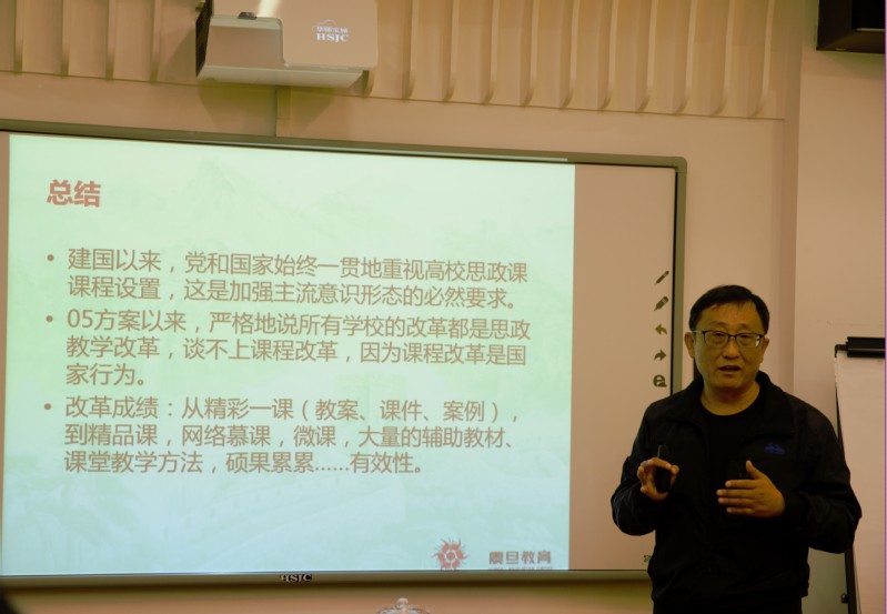 黨委書記黃晞建做總結(jié)講話,他指出推進(jìn)思政課程改革確定了整體方案,明確了方向,接下來重要的是怎么做,我們要以高校思政工作會(huì)議、十九大為契機(jī),做到貼近形勢(shì)、貼近學(xué)生、產(chǎn)生效果。教材、形勢(shì)與學(xué)生新的變化三者結(jié)合,同城異地協(xié)同,做好學(xué)生思想政治教育工作,培養(yǎng)德智體美全面發(fā)展的社會(huì)主義建設(shè)者和接班人。