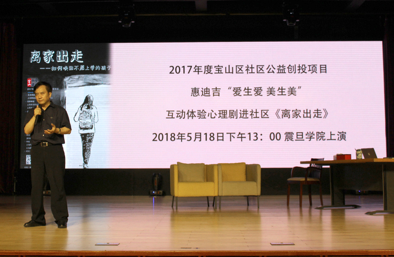 2018年5月18日下午13:00,由上海震旦職業(yè)學(xué)院學(xué)生處心理健康教育中心承辦,上?;莸霞嫒诵睦黻P(guān)愛中心主辦,2017年度寶山區(qū)社區(qū)公益創(chuàng)投項(xiàng)目的互動(dòng)體驗(yàn)心理劇《離家出走》在本部校區(qū)大禮堂完美落幕。上海市教育名師、震旦教育集團(tuán)黨委書記黃晞建教授進(jìn)行了開場(chǎng)致詞,黃書記講道:“學(xué)習(xí)心理學(xué)可以強(qiáng)身健體提高免疫力,學(xué)會(huì)面對(duì)現(xiàn)實(shí)積極生活”。黨委副書記夏臻,院辦主任張莉,學(xué)生處處長毛燕靜,資助中心主任梁霄及心理健康教育中心專兼職老師與來自六個(gè)二級(jí)學(xué)院的近300名震旦學(xué)院師生和附近居民觀看了此次心理劇。