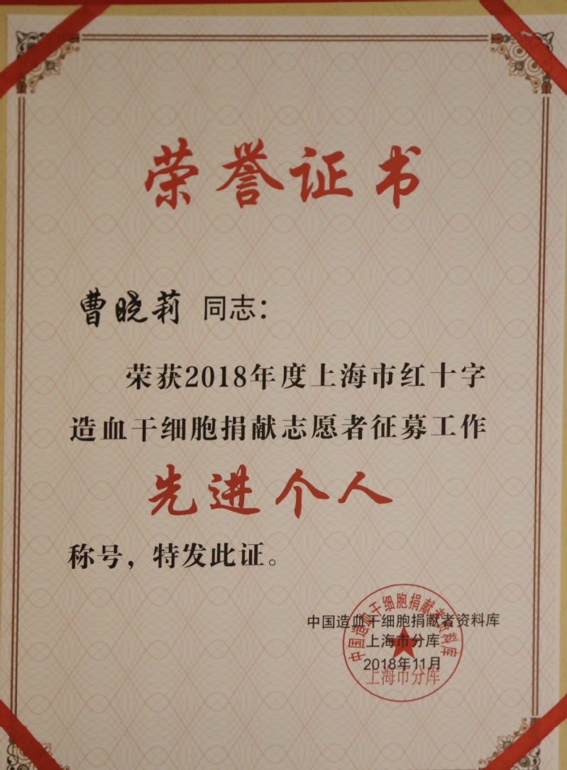 2018年12月5日,由上海市紅十字會、共青團上海市委員會、上海市青少年服務(wù)和權(quán)益保護辦公室主辦的“為了生命的希望工程”2018年上海市青年造血干細胞捐獻志愿者集中行動在上海交通大學(xué)醫(yī)學(xué)院附屬第九人民醫(yī)院舉行。會上,集中表彰了2018年造血干細胞捐獻宣傳動員工作先進集體和個人,我校榮獲“2018年度造血干細胞捐獻志愿者征募工作先進集體”,我校團委書記曹曉莉老師榮獲“2018年度上海市紅十字造血干細胞捐獻志愿者征募工作先進個人”。截止目前,我校共有1624名青年師生志愿者加入中國造血干細胞捐獻者資料庫。志愿情懷,奔騰不息,我校師生用實際行動向社會和公眾展現(xiàn)了震旦人高尚的精神品格和價值追求。
