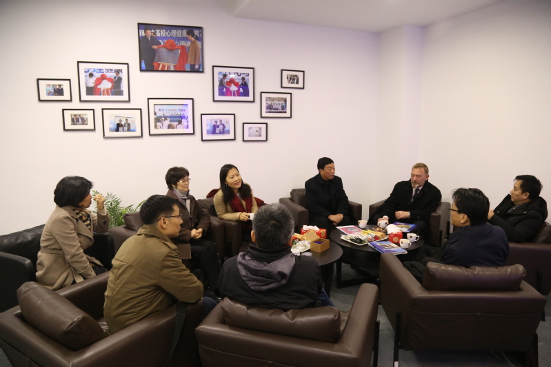 2018年12月14日15:00,牛津大學(xué)心理中心主任Alan Percy和牛津大學(xué)展望計劃負責人王士東教授一行來訪我校,并參觀建于美蘭湖校區(qū)的上海市民辦高校心理健康教育基地。上海市民辦高校心理健康教育基地負責人、上海震旦職業(yè)學(xué)院黨委書記黃晞建主持此次會談,民創(chuàng)牛津項目推進者、上海市教委辦公室主任李興華、上海學(xué)生心理健康教育發(fā)展中心主任李正云、復(fù)旦大學(xué)心理中心主任劉明波、上海交通大學(xué)心理咨詢中心主任楊文圣、上海杉達學(xué)院黨委副書記陳暐、上海震旦職業(yè)學(xué)院校長陳力華、黨委副書記夏臻、副校長王純玉一同參加了此次會談。校國際交流處費紅楓老師擔任翻譯。