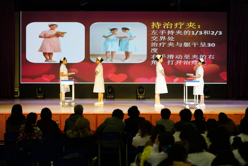 本次比賽分為個人賽和團體賽兩部分。選手們統(tǒng)一身著整潔的護士服,在個人賽部分進行了站姿、蹲姿、坐姿及搬椅子等動作的展示。挺拔、自然、優(yōu)雅的形象深入人心,贏得了觀眾的陣陣掌聲。團體賽部分,選手們以班級為單位,從端治療盤、持病歷夾、推治療車三個方面,對護理禮儀進行了精彩的展示,將本次比賽推上了高潮。經(jīng)過兩個小時的激烈角逐,本次比賽決出了個人賽、團體賽一二三等獎。