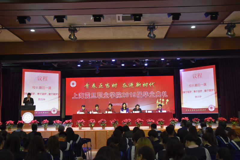 2019年6月17日上午,上海震旦職業(yè)學(xué)院 “青春正當(dāng)時,奮進(jìn)新時代” 2019屆畢業(yè)典禮在大禮堂隆重舉行。震旦教育創(chuàng)始人、震旦教育發(fā)展基金會理事長張惠莉、上海震旦教育集團(tuán)董事長張沈、黨委書記黃晞建、校長陳力華、黨委副書記夏臻、副校長王純玉、副校長張雅麗出席了此次典禮。各二級學(xué)院院長、黨總支書記、教師代表、全體輔導(dǎo)員、優(yōu)秀畢業(yè)生家長代表以及2019屆畢業(yè)生共同參與此次典禮。典禮由學(xué)生處處長毛燕靜主持。