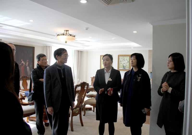 會后,在黨總支書記徐霞、酒店管理專業(yè)實(shí)驗(yàn)教學(xué)中心主任董偉玲的陪同下,考察組參觀了酒店運(yùn)營研究中心、酒文化實(shí)驗(yàn)教學(xué)中心、客房實(shí)驗(yàn)教學(xué)中心、茶文化實(shí)驗(yàn)教學(xué)中心、智慧套房等實(shí)訓(xùn)中心。徐老師介紹,酒店專業(yè)的理論教學(xué)和實(shí)訓(xùn)融為一體,實(shí)踐教學(xué)貫穿始終。參觀中考察組對實(shí)訓(xùn)基地贊不絕口。