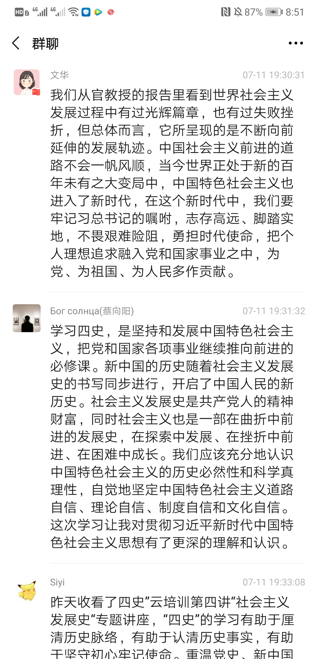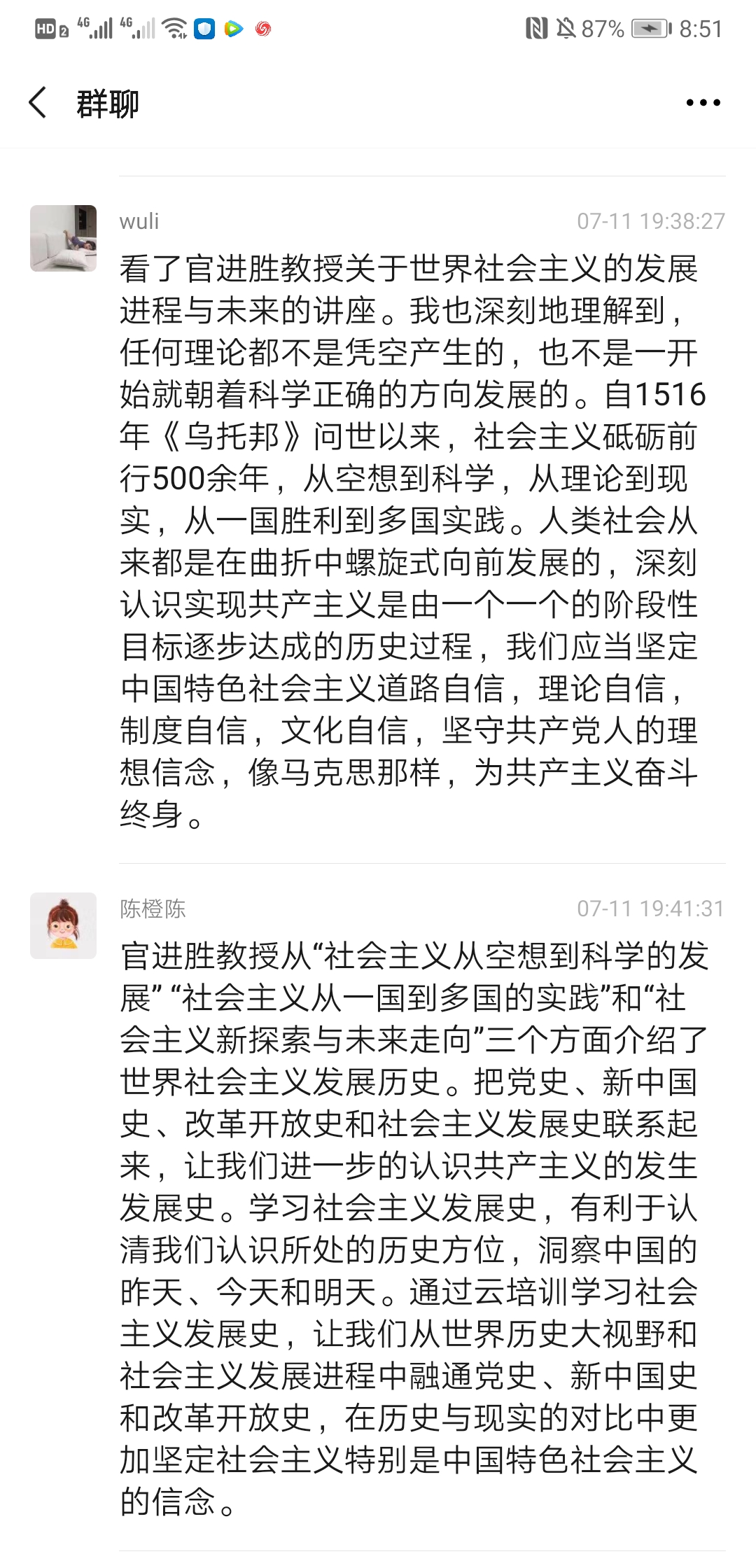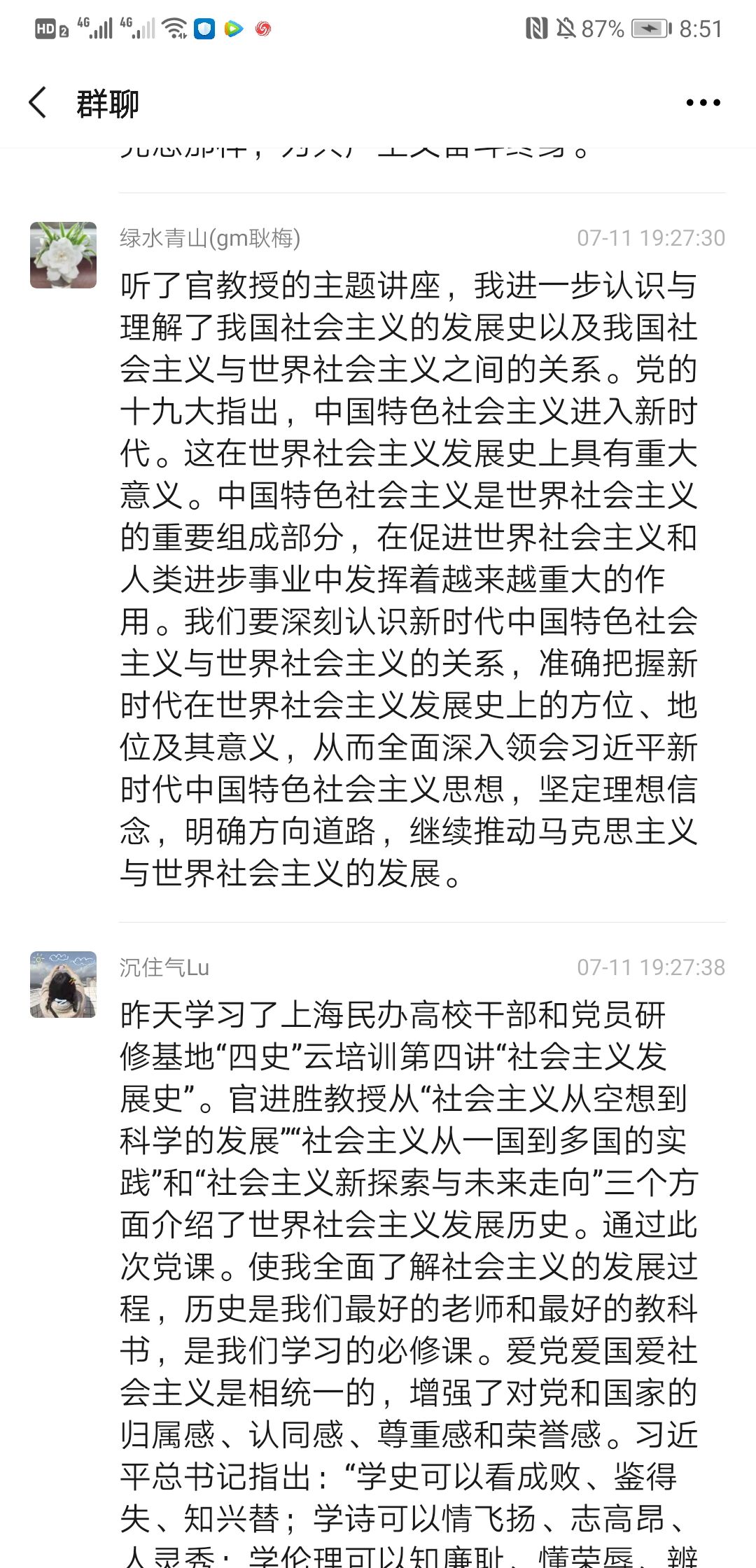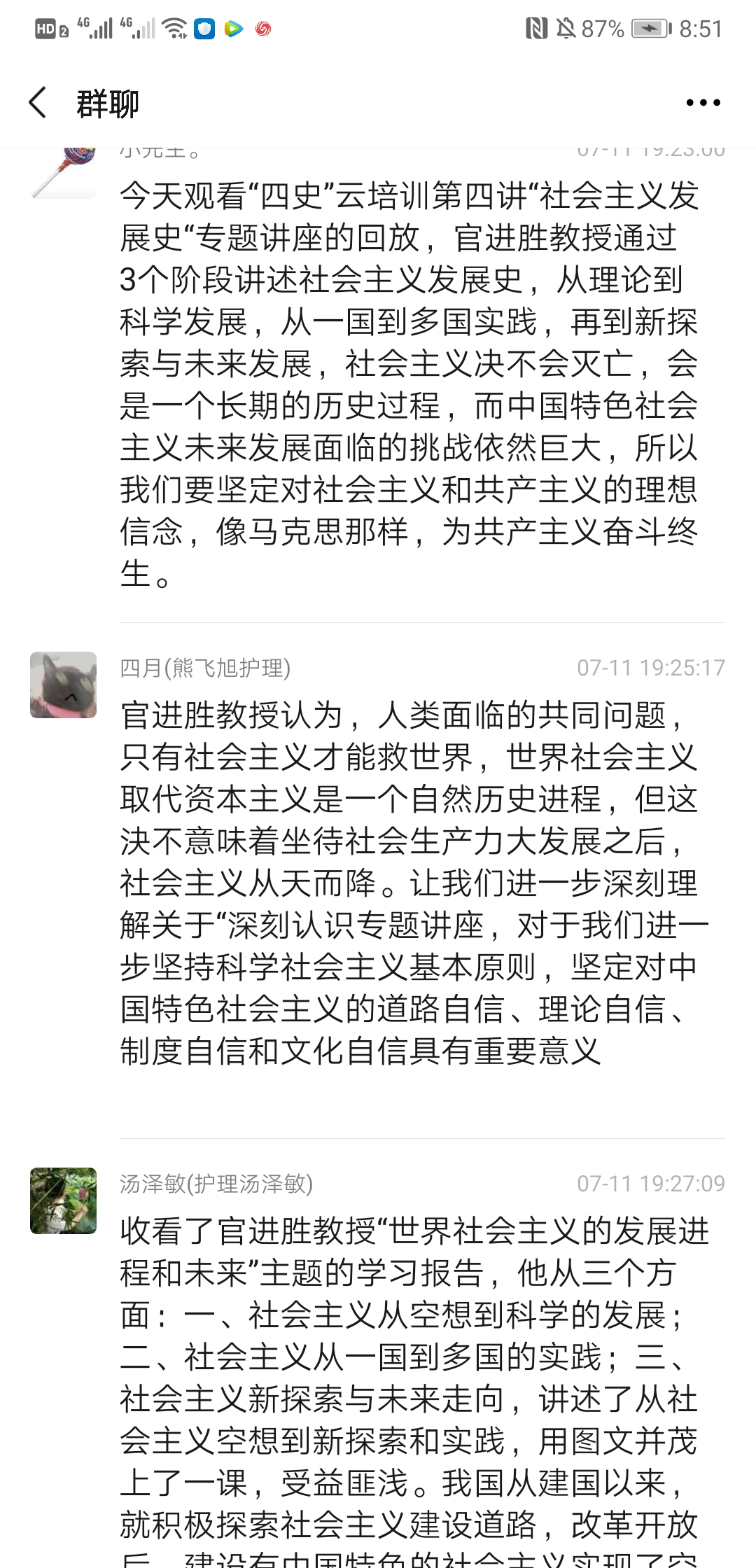 2020年7月10日上午9:30,上海民辦高校干部和黨員研修基地“四史”云培訓(xùn)第四講“世界社會主義的發(fā)展進(jìn)程與未來”專題講座準(zhǔn)時開講,主講人是上海市委黨??茖W(xué)社會主義教研部主任官進(jìn)勝教授。為加強師生黨員同志對社會主義發(fā)展史的認(rèn)識和理解,公共衛(wèi)生與護(hù)理學(xué)院黨總支組織所有師生黨員收看了官教授的講座,并于11日晚19:00-20:00開展了一次線上研討會,共同探討本次講座的學(xué)習(xí)心得與體會,師生黨員同志們系統(tǒng)地回顧了世界社會主義的發(fā)展歷程,進(jìn)一步加深了對社會發(fā)展規(guī)律的認(rèn)識,增強了對中國走社會主義道路的決心和信心,對世界社會主義的美好前景充滿期待。以下是部分同志發(fā)言記錄: