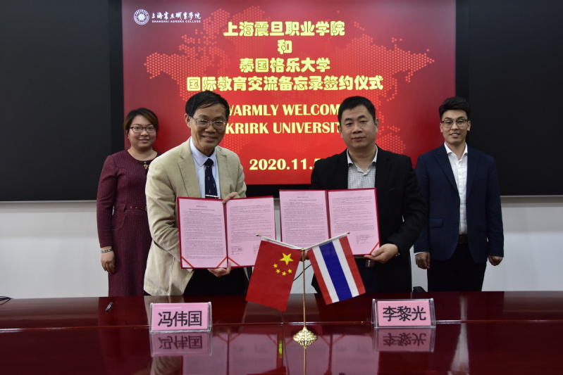 2020年11月5日,泰國格樂大學管理委員會委員李黎光博士、上海·浙江國際事務中心主任張超一行三人到訪上海震旦職業(yè)學院。我校校長馮偉國博士及國際交流處熱情接待了到訪來賓。雙方就兩校今后在震旦開展專升本、專升碩等留學升學途徑等問題進行了探討。