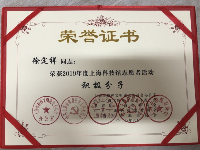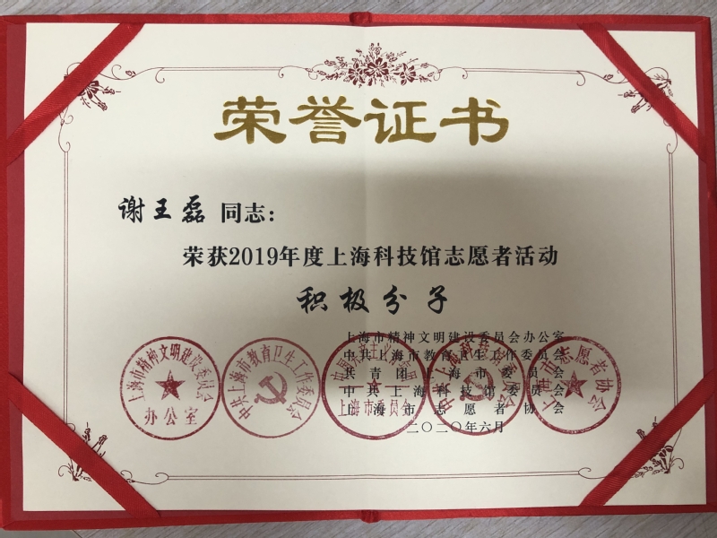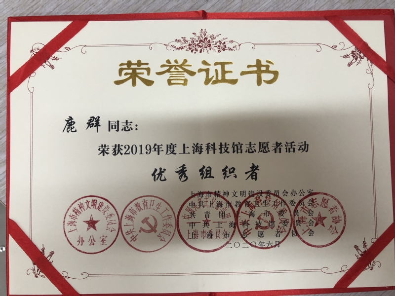 在2019年度上??萍拣^志愿服務(wù)工作中,我校榮獲“2019年度上海科技館志愿者活動表揚(yáng)集體”稱號,經(jīng)濟(jì)管理學(xué)院團(tuán)總支書記鹿群老師被授予“2019年度上??萍拣^志愿者活動優(yōu)秀組織者”稱號,社會實(shí)踐部謝王磊、楊東、徐定祥同學(xué)被授予“2019年度上??萍拣^志愿者活動積極分子”稱號。
