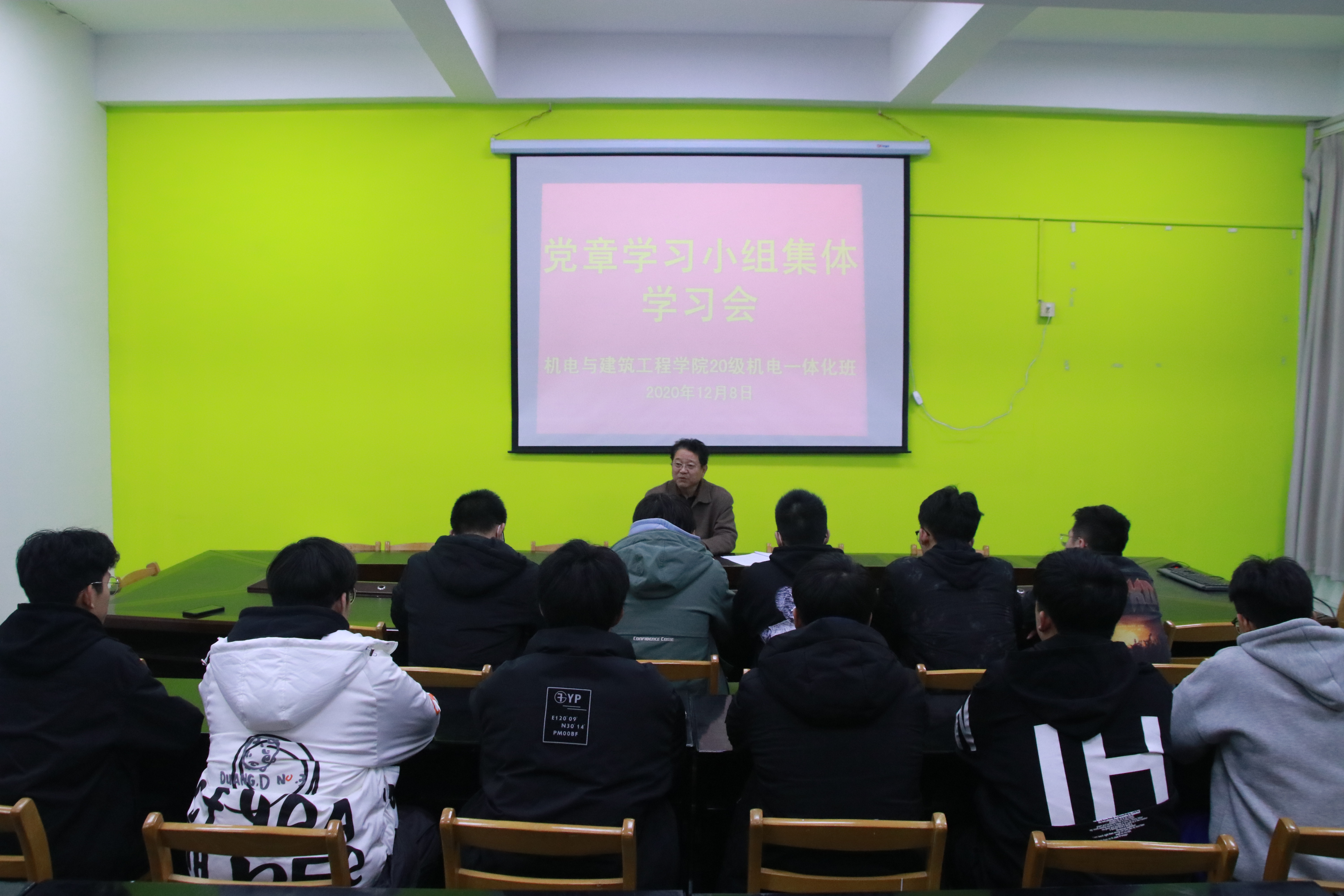 2020年12月8日晚,機電與建筑工程學(xué)院20級機電一體化班《黨章》學(xué)習(xí)小組在美蘭湖校區(qū)1-301會議室開展集體學(xué)習(xí)。該班輔導(dǎo)員、黨總支書記陳亞立主持學(xué)習(xí),全體入黨申請人參加了學(xué)習(xí)。