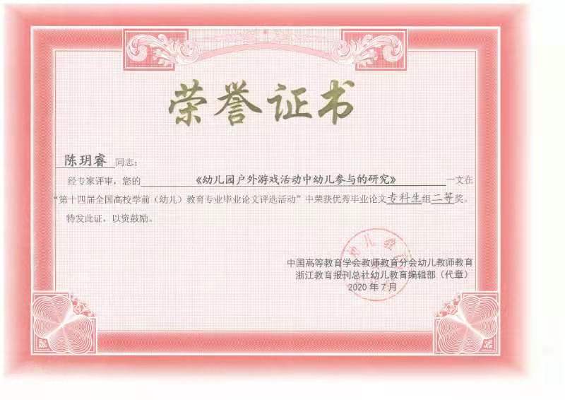 第十四屆全國高校學(xué)前(幼兒)教育專業(yè)優(yōu)秀畢業(yè)論文評選活動于2020年6月順利進(jìn)行。經(jīng)過華東師范大學(xué)、南京師范大學(xué)、華南師范大學(xué)等高校專家盲審,我校17級學(xué)前教育專業(yè)2班陳玥睿同學(xué)的畢業(yè)論文《幼兒園戶外游戲活動中幼兒參與的研究》在全國800余所高校的1300余篇優(yōu)秀畢業(yè)論文中脫穎而出,榮獲??平M二等獎。