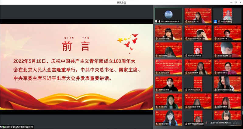 2022年5月10日,慶祝中國(guó)共產(chǎn)主義青年團(tuán)成立100周年大會(huì)在北京人民大會(huì)堂隆重舉行。為提高我院學(xué)生思想理論水平和政治素養(yǎng),鼓勵(lì)廣大青年匯聚青春力量,砥礪前行,讓夢(mèng)想騰飛,5月15日,教育學(xué)院學(xué)生會(huì)春季培訓(xùn)會(huì)于線上會(huì)議順利召開(kāi),學(xué)院團(tuán)總支委員參加線上會(huì)議。會(huì)議由團(tuán)總支書(shū)記吳蜜蜜老師主持。