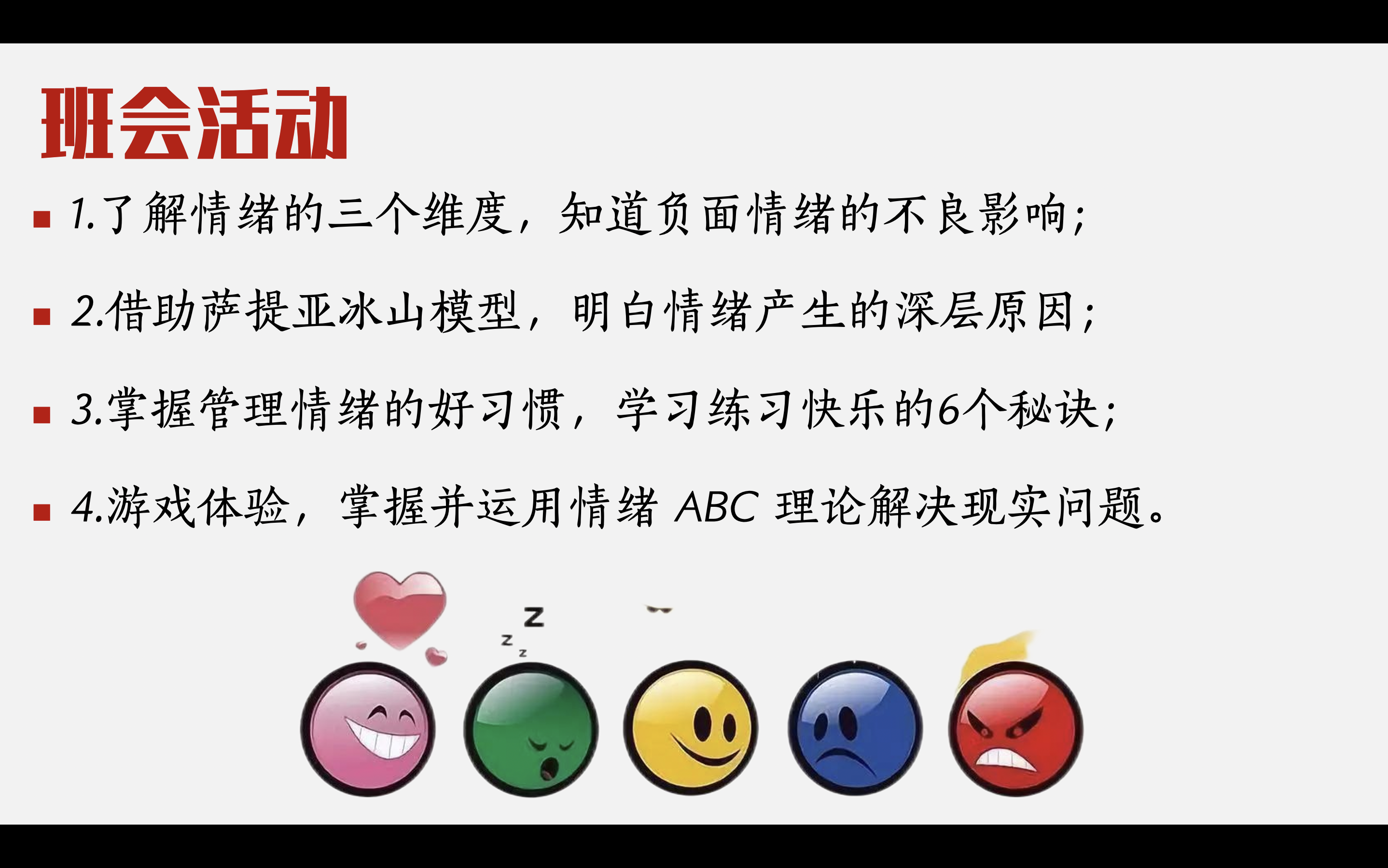 三.活動過程。認識“情緒”真面目:什么是“情緒”、解讀情緒的三個維度、負面情緒的不良影響;了解情緒的深層原因:播放視頻《薩提爾的內(nèi)在冰山》、真實故事的練習、深層次探索、啟示;管理情緒,練習快樂:交流討論‘網(wǎng)上有這樣一句話:“不要因為5分鐘的不開心,就耽誤你23小時55分鐘的開心’。游戲體驗;情景還原、播放視頻《情緒ABC理論》、故事新編、欣賞歌曲《海闊天空》