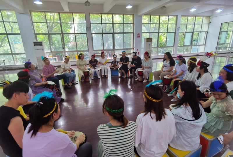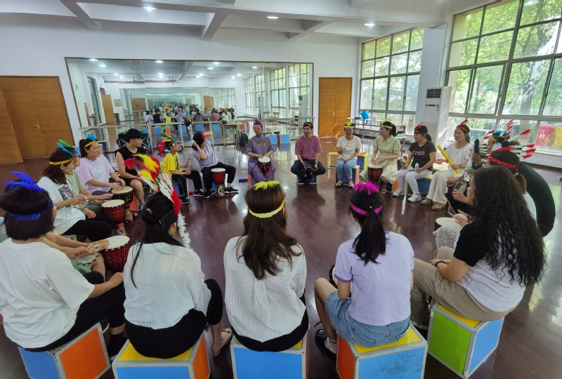 隨后,聶老師進(jìn)入鼓圈中間,通過節(jié)奏、分聲部、三點(diǎn)雷達(dá)等技術(shù)引導(dǎo)輔導(dǎo)員們體驗(yàn)鼓圈的團(tuán)隊(duì)精神和節(jié)奏魅力。聶老師還講解了非洲鼓的起源,并教大家演奏非洲鼓。來自新疆的夏依旦老師和林忠蘭老師在《掀起你的蓋頭來》的音樂中翩翩起舞,馬合木提老師打鼓伴奏,聶老師吹琴伴奏,將整個(gè)活動(dòng)的氣氛推向了高潮。