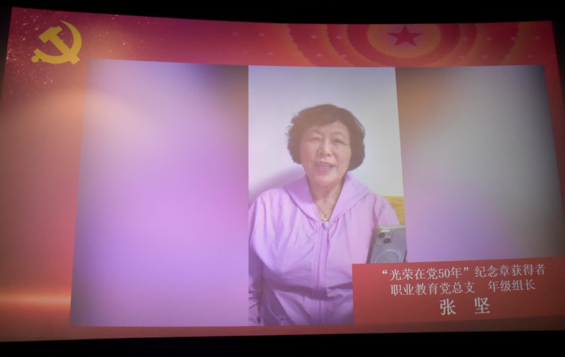 會(huì)上,職教部黨總支在黨50年的張堅(jiān)老師通過(guò)視頻,向在座的黨員同志講述了自己加入黨組織50年來(lái)的經(jīng)歷與感悟。震旦職業(yè)學(xué)院黨委書(shū)記黃晞建向張堅(jiān)同志頒發(fā)了“光榮在黨50年”紀(jì)念章,由職教部黨總支書(shū)記鐘劼菁代為領(lǐng)取。