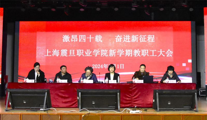 2024年3月1日上午,上海震旦職業(yè)學(xué)院在校大禮堂召開“激昂四十載 奮進新征程”新學(xué)期教職工大會。震旦教育集團創(chuàng)始人、震旦教育發(fā)展基金會理事長張惠莉,震旦教育集團董事長張沈,黨委書記吳松,校長蔣心亞,副校長王純玉等領(lǐng)導(dǎo)出席大會,上海震旦職業(yè)學(xué)院全體教職工參加會議。大會由組織部部長黃敏主持。