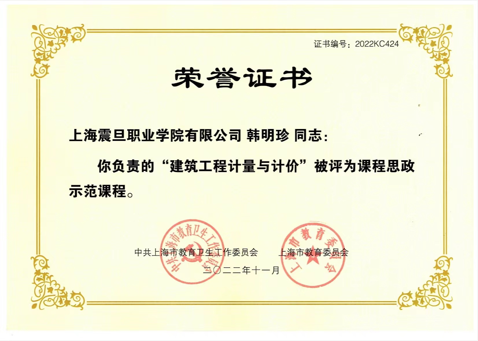 2022年上海市教衛(wèi)委、上海教委開展“上海學(xué)校課程成思政建設(shè)提升行動”,學(xué)校智能工程學(xué)院教師陳萍榮獲上海市課程思政教學(xué)名師稱號,這是上海民辦高校中唯一獲此稱號的教師;另有4門課獲上海市課程思政示范課程;“建筑工程計量與計價”課程教學(xué)團隊獲示范團隊。