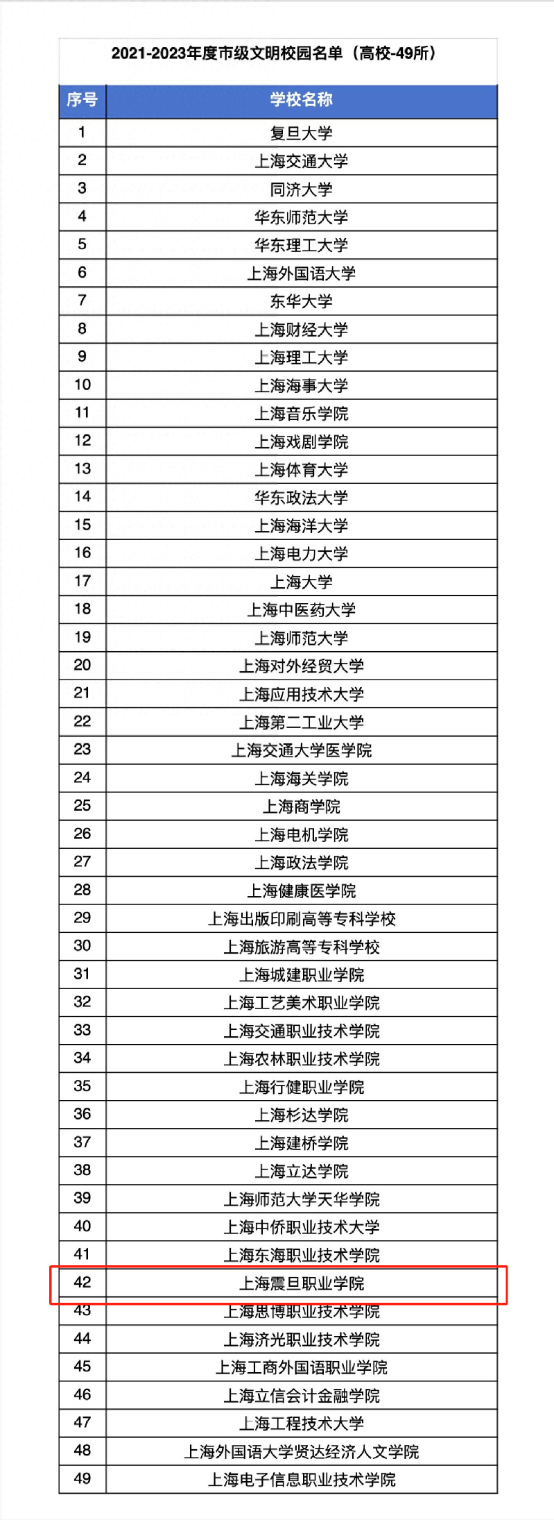 近日,上海市精神文明建設(shè)辦公室下發(fā)《完成2021-2023年度市級文明創(chuàng)建任務(wù)的城區(qū)、村鎮(zhèn)、單位、家庭、校園、社區(qū)(小區(qū))、行業(yè)名單》,上海震旦職業(yè)學(xué)院榮獲2021-2023年度“上海市文明校園”光榮稱號。