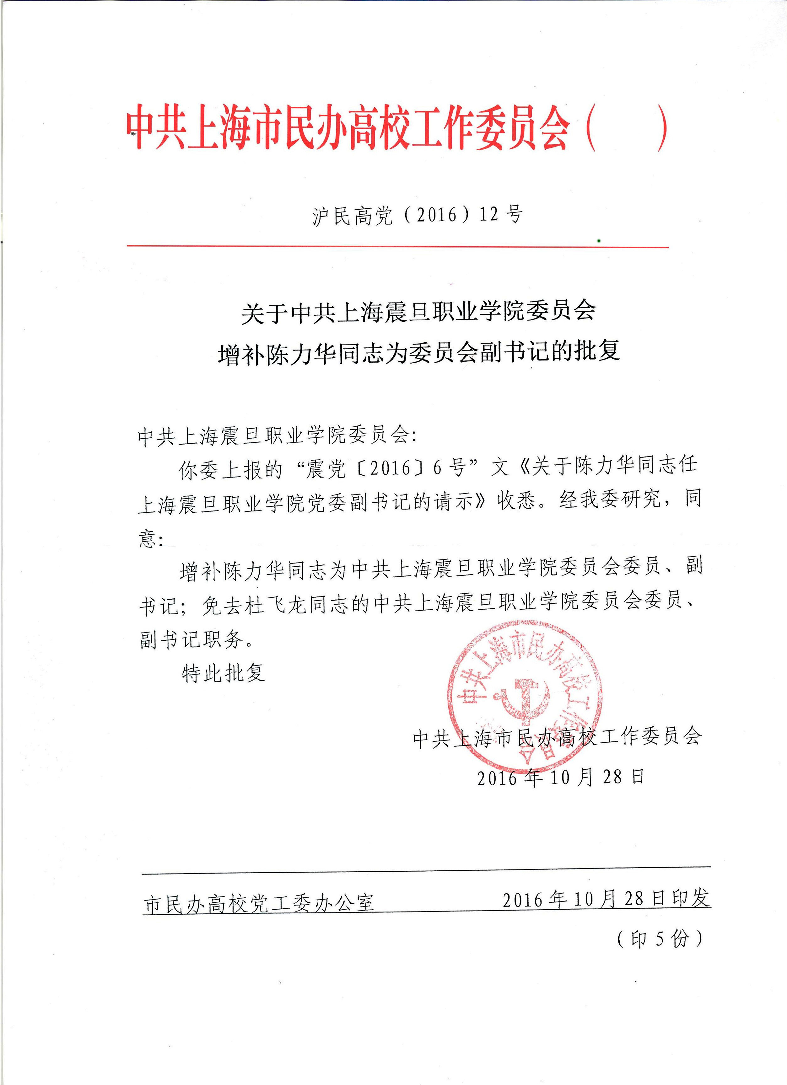 關(guān)于中共上海震旦職業(yè)學(xué)院委員會增補(bǔ)陳力華同志為委員會副書記的批復(fù)